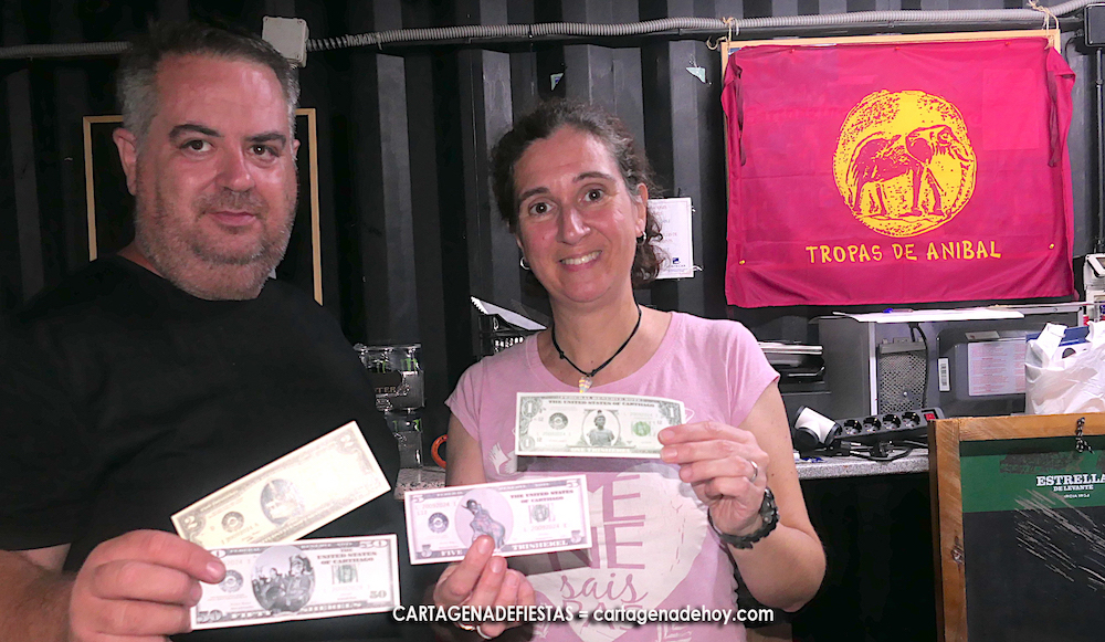 Uxama estrenó hace años el 'US' como moneda de su campamento y en 2023 fue la cantina de Tropas de Baal-Hammon la que incorporá el 'Baal' para el pago de consumisiones. Este año surge el 'Trishekel', que era el nombre que recibían las monedas acuñadas por Cartago en Iberia para afrontar los gastos de sus ejércitos. En la foto, Vicente y Paqui muestran estos billetes.