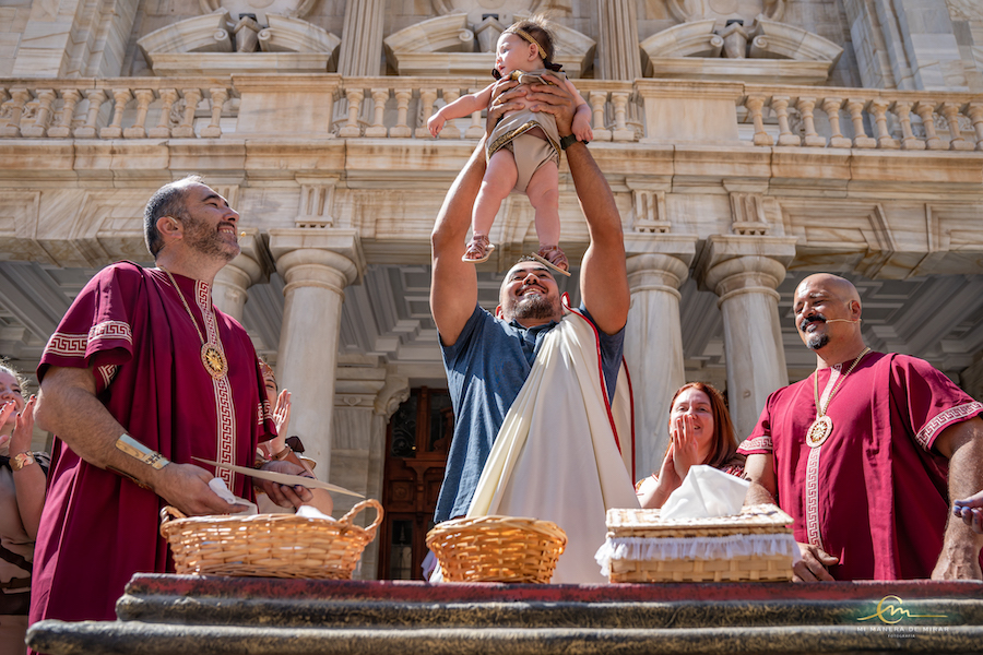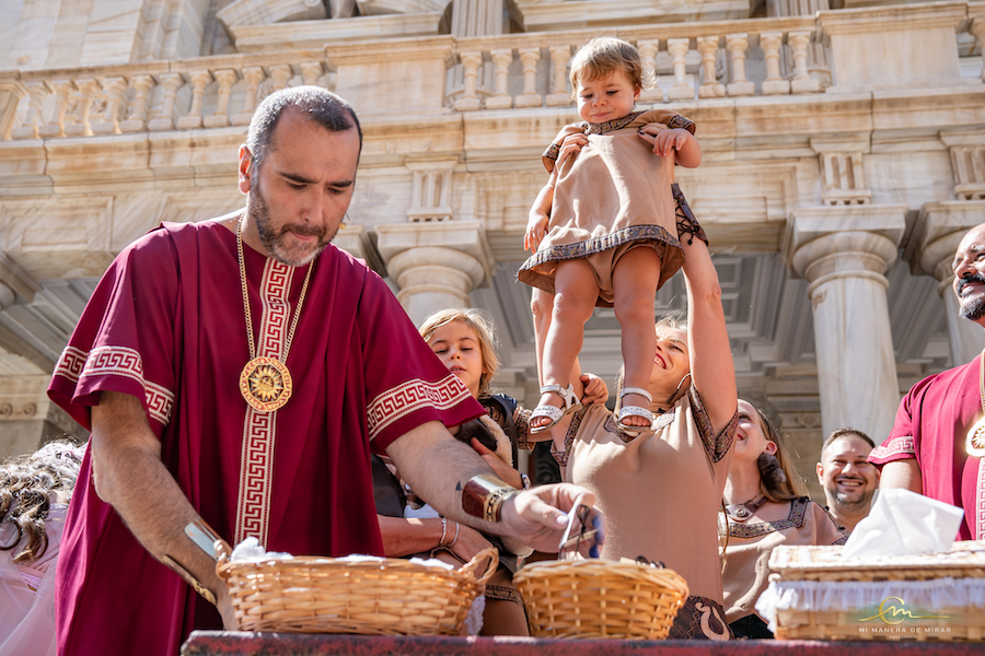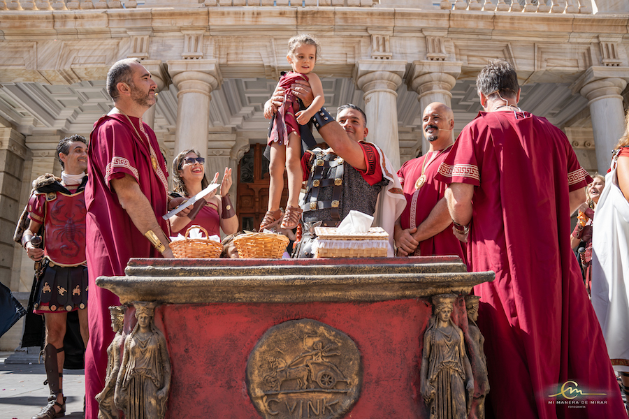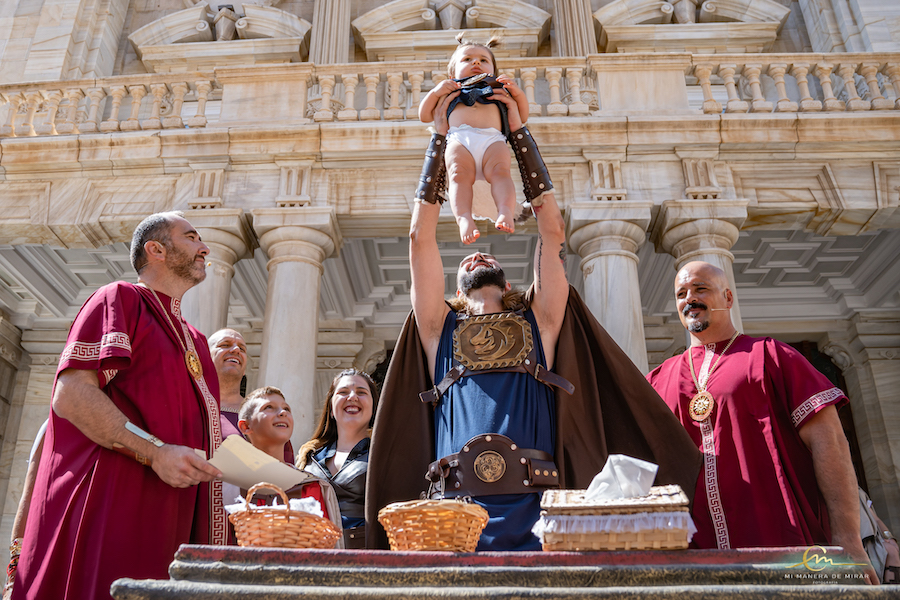 Los nuevos festeros de ambos bandos son bautizados al rito romano. Sus huellas son plasmadas en los diplomas conmemorativos y cada presencia culmina con los padres o abuelos elevando a los pequeños al cielo, hacia los dioses. También se le impone la ‘bulla’, amuleto con el que se alejaba el ‘mal de ojo’.