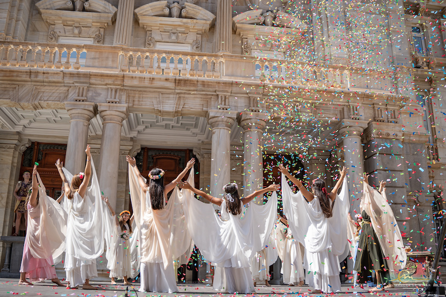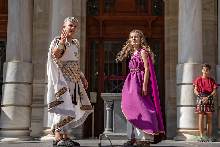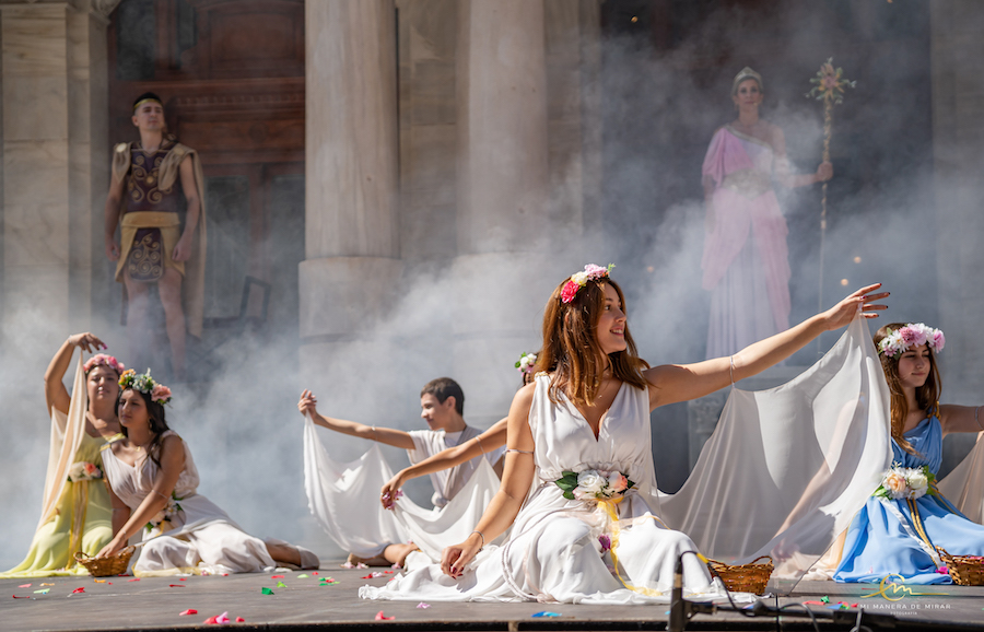 Tras un vistoso y soleado inicio con danzas y música épica, aparecen en el escenario la triada capitalina de dioses (Apolo, Juno y Jano,), ante los que se va efectuando el ritual de forma fidedigna a como sucedía en esta tierra en la Carthagonova romana.
