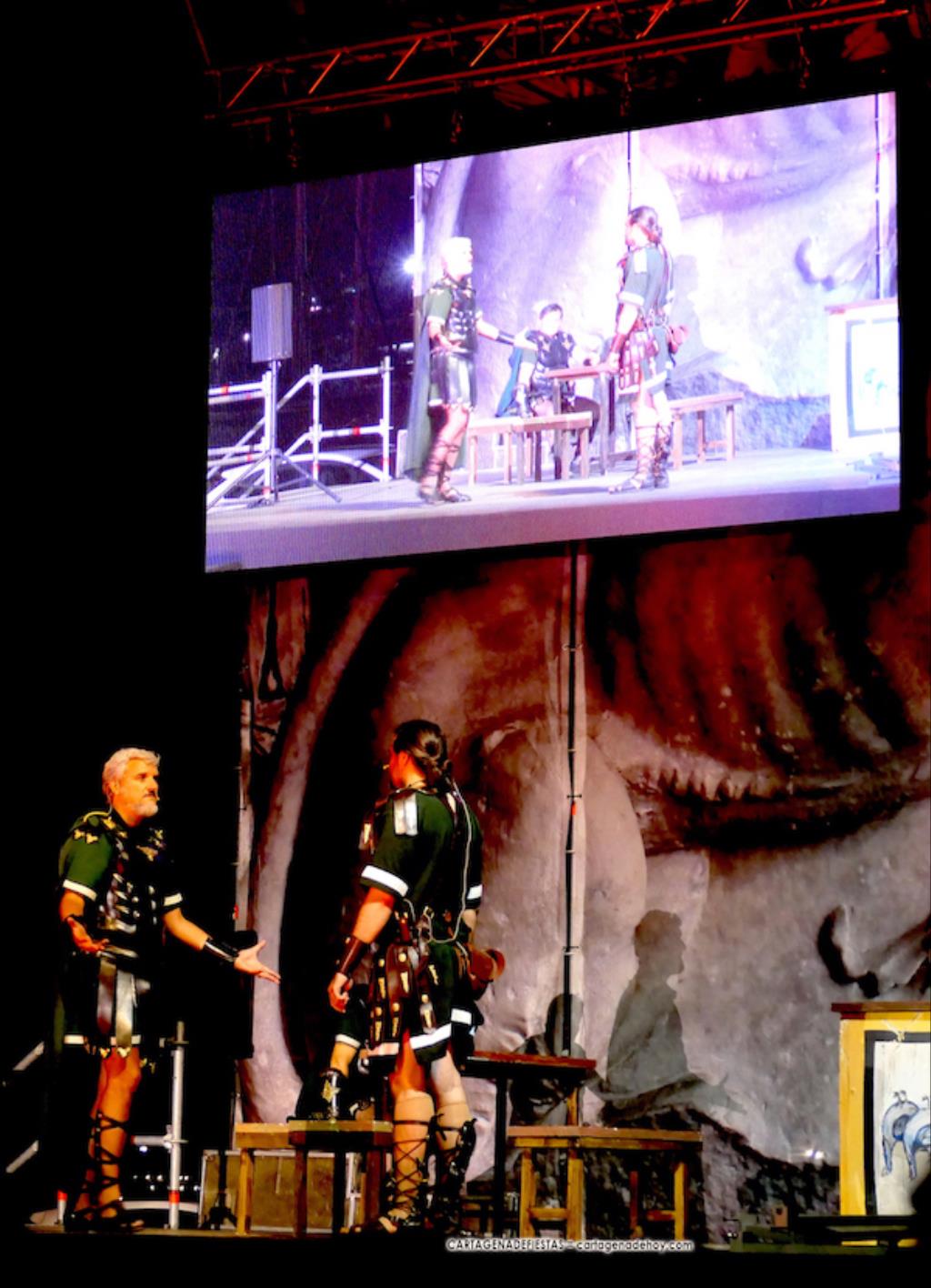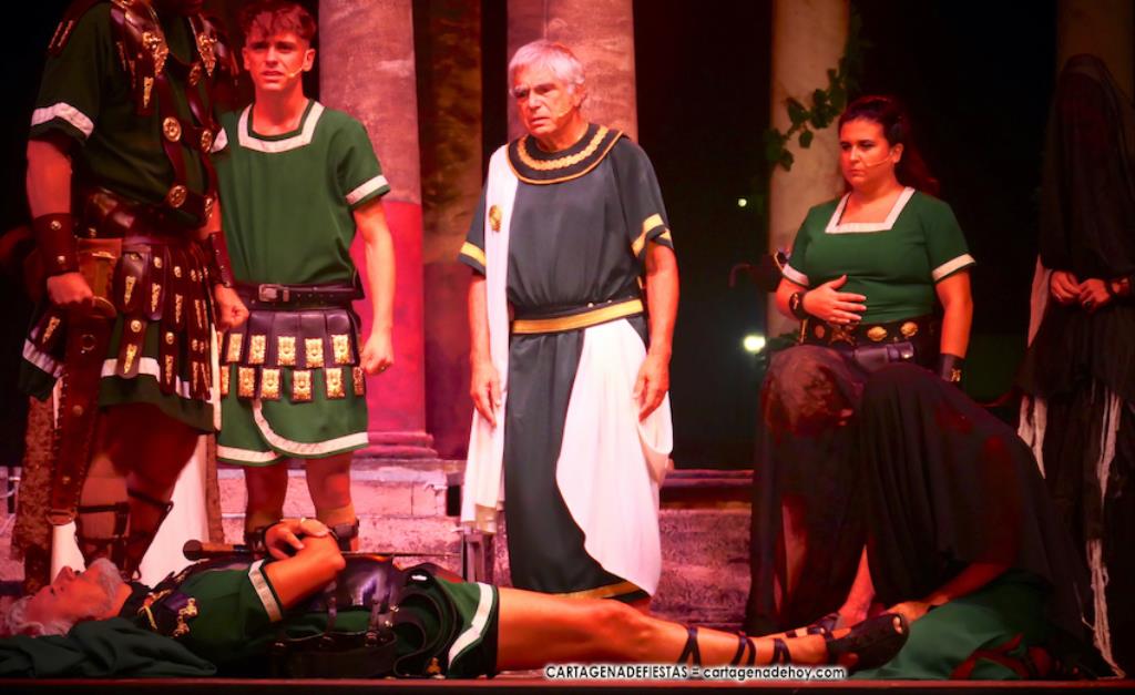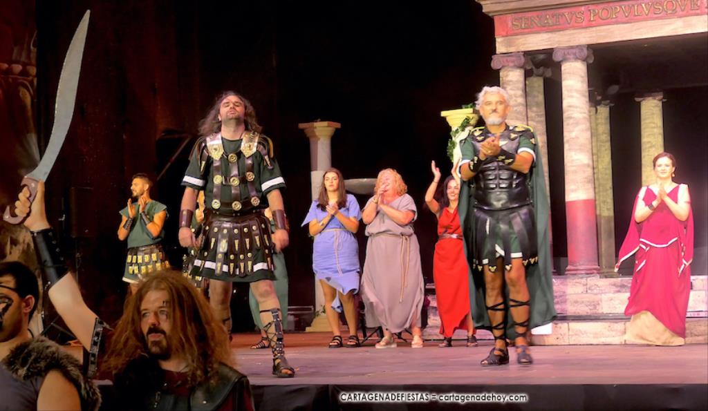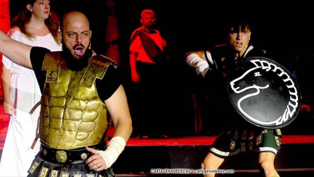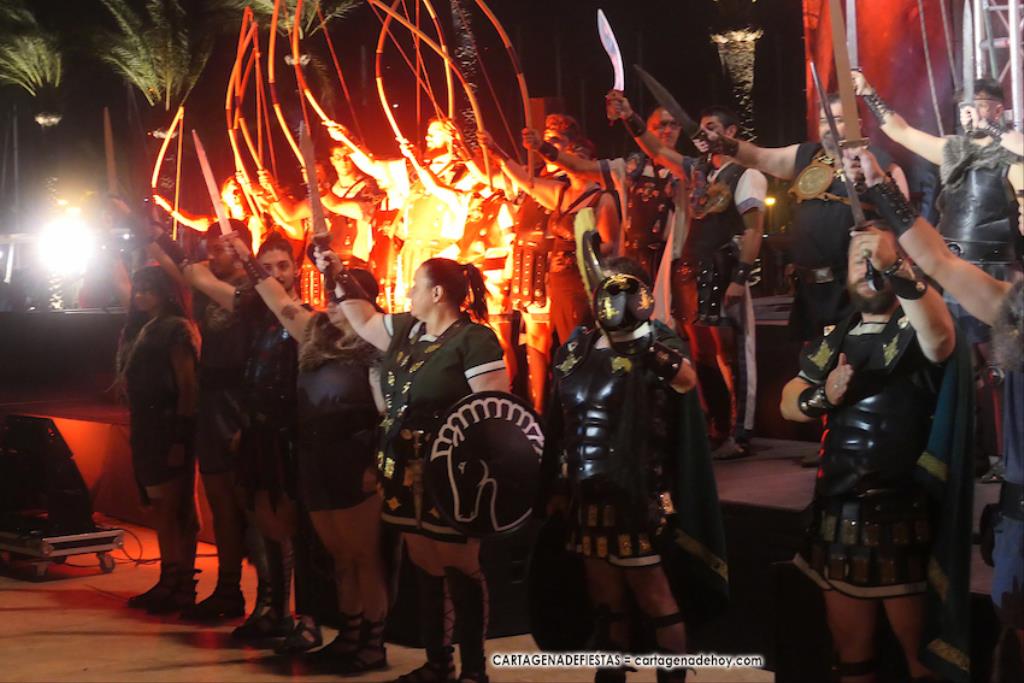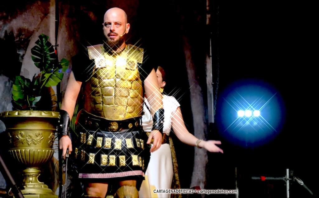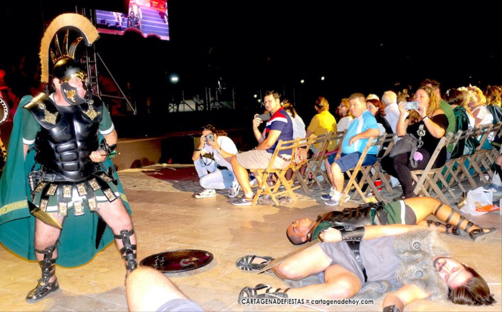 La IA ya está en las históricas fiestas de Cartagena. Su primer acto de presencia (s.e.u.o.), lo ha hecho a través de la representación de la 'Destrucción de Sagunto' con la rockera canción que acompañó al saludo de los actores tras acabar la puesta en escena, que en esta ocasión tuvo, por primera vez también, a Juanjo Núñez con la 'batuta' de dirección, además de interpretar a Valerio (antes Teucro), que este año fue el último legionario en morir.