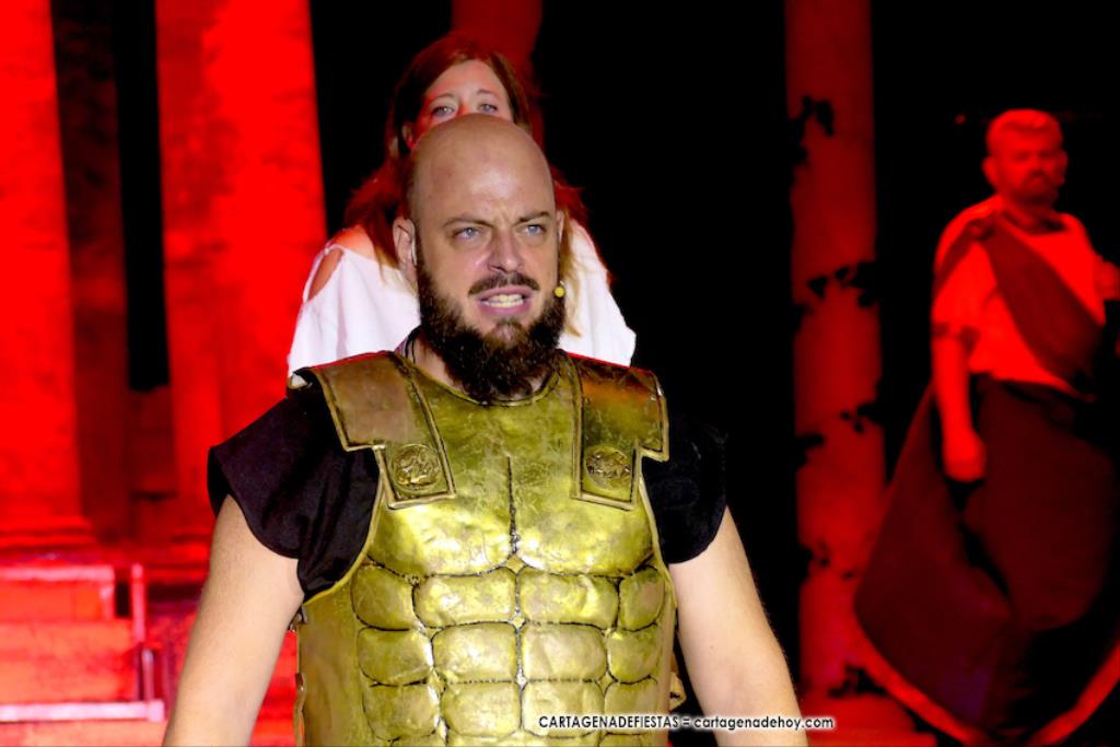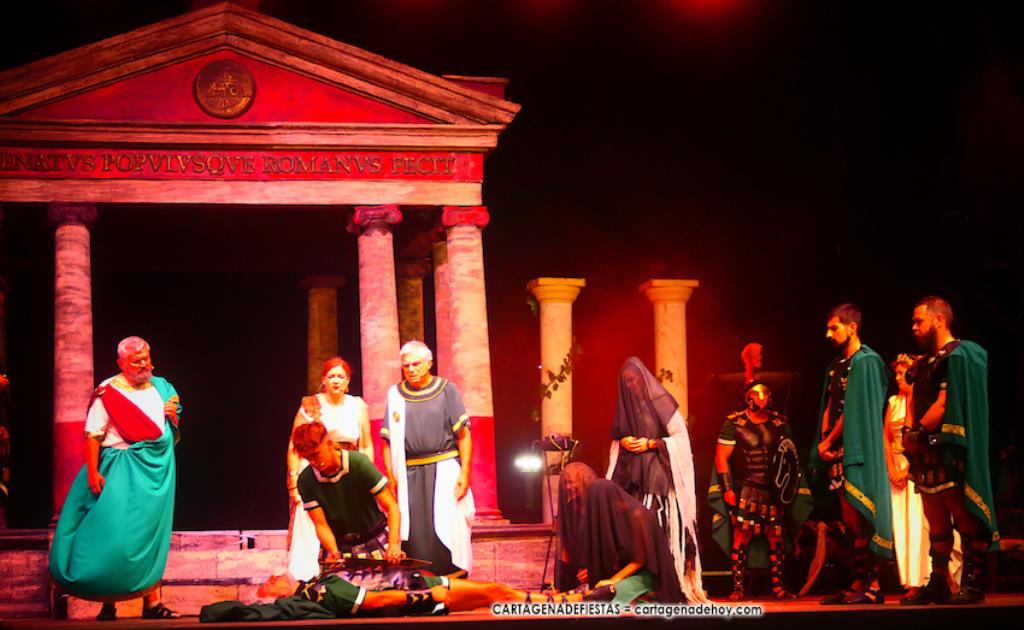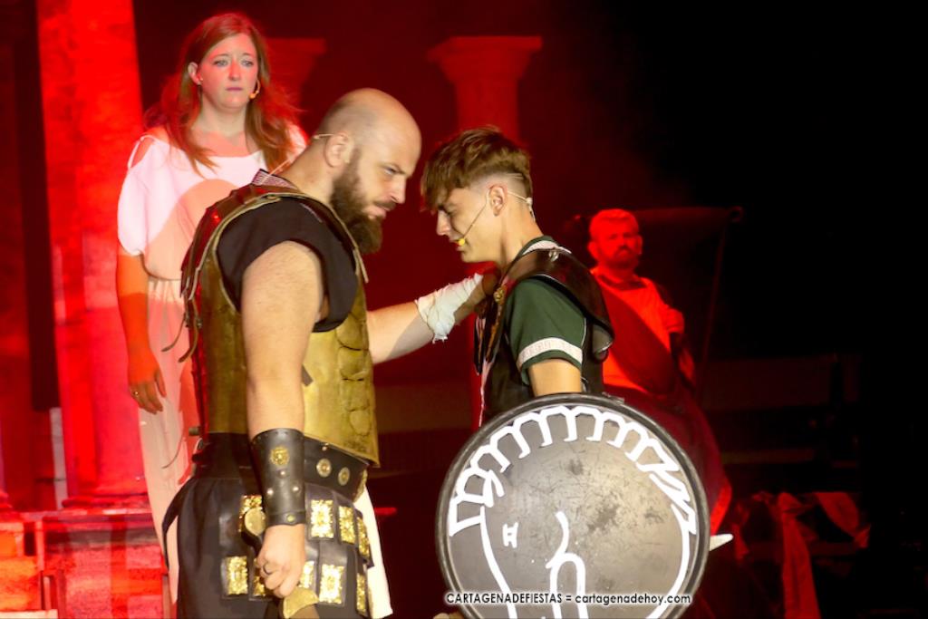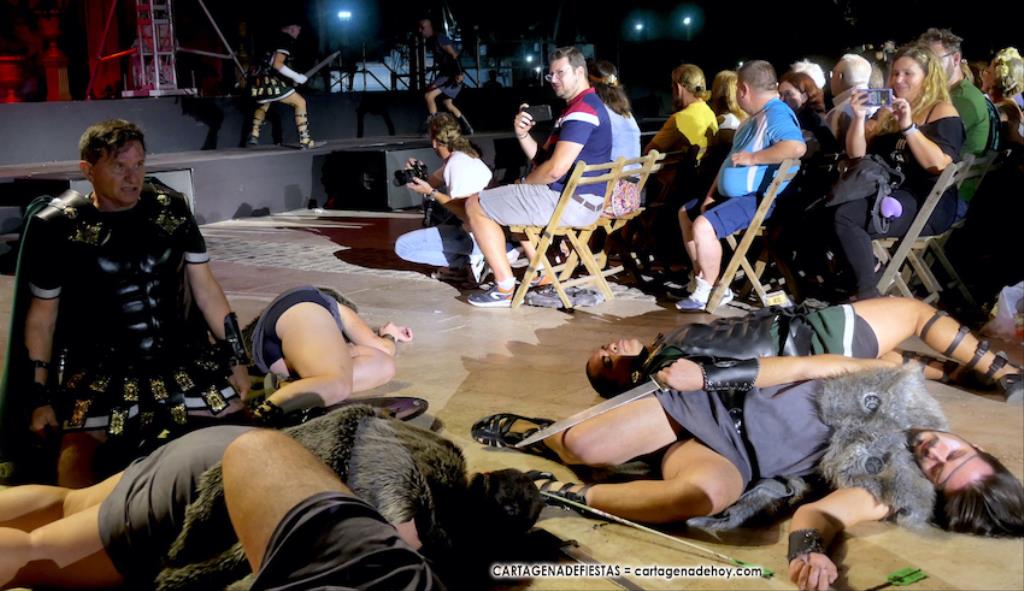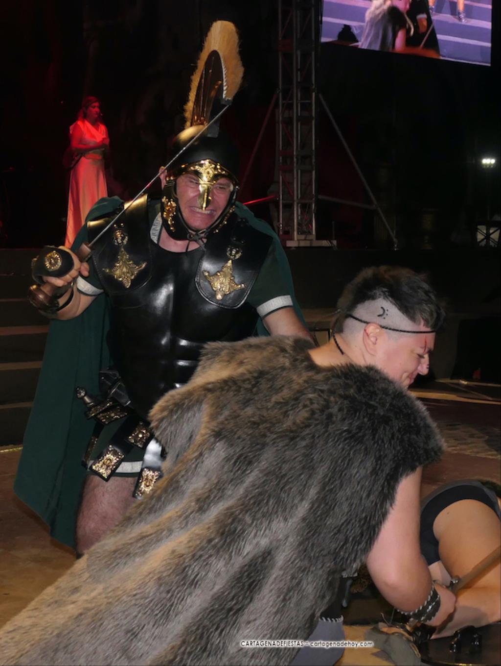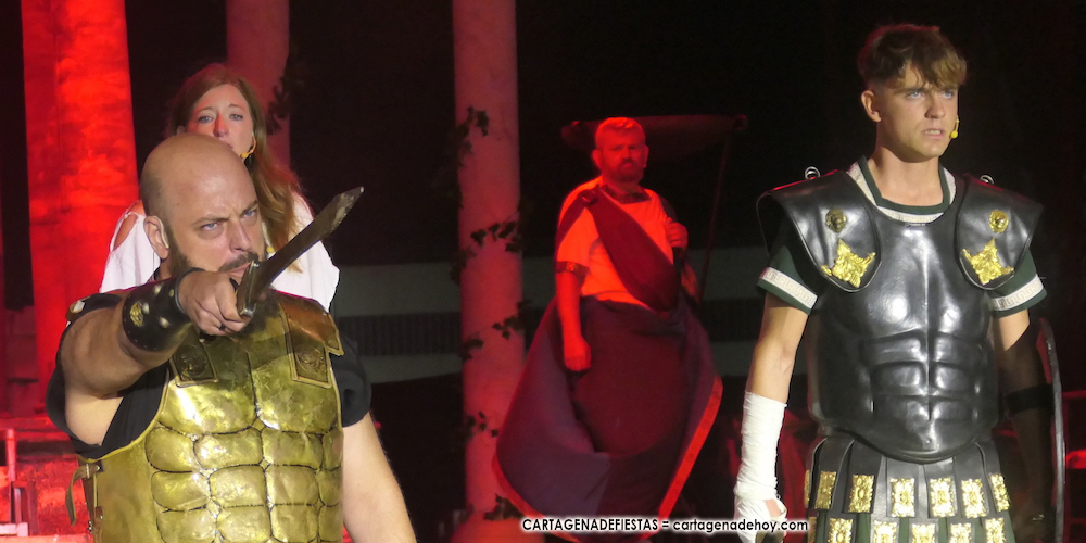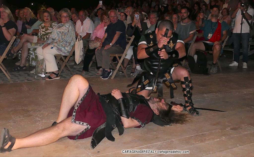 La IA ya está en las históricas fiestas de Cartagena. Su primer acto de presencia (s.e.u.o.), lo ha hecho a través de la representación de la 'Destrucción de Sagunto' con la rockera canción que acompañó al saludo de los actores tras acabar la puesta en escena, que en esta ocasión tuvo, por primera vez también, a Juanjo Núñez con la 'batuta' de dirección, además de interpretar a Valerio (antes Teucro), que este año fue el último legionario en morir.