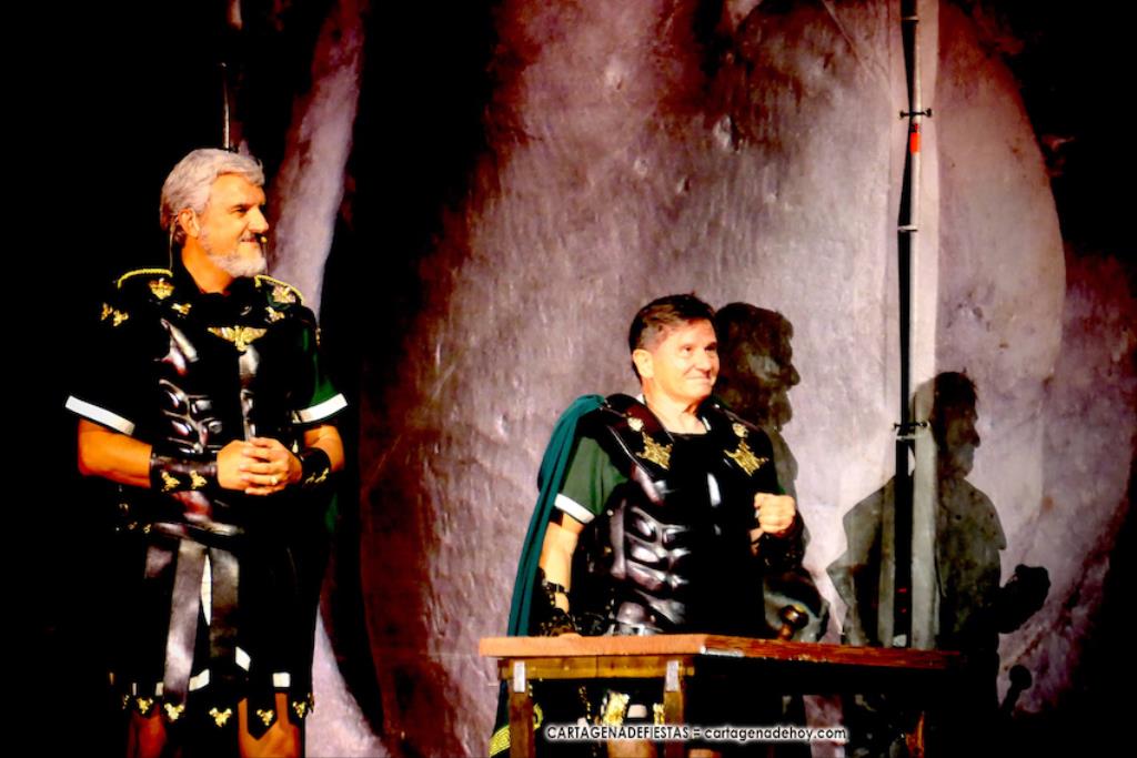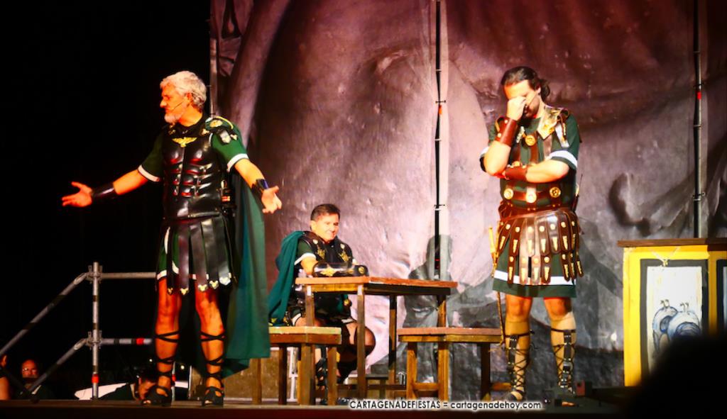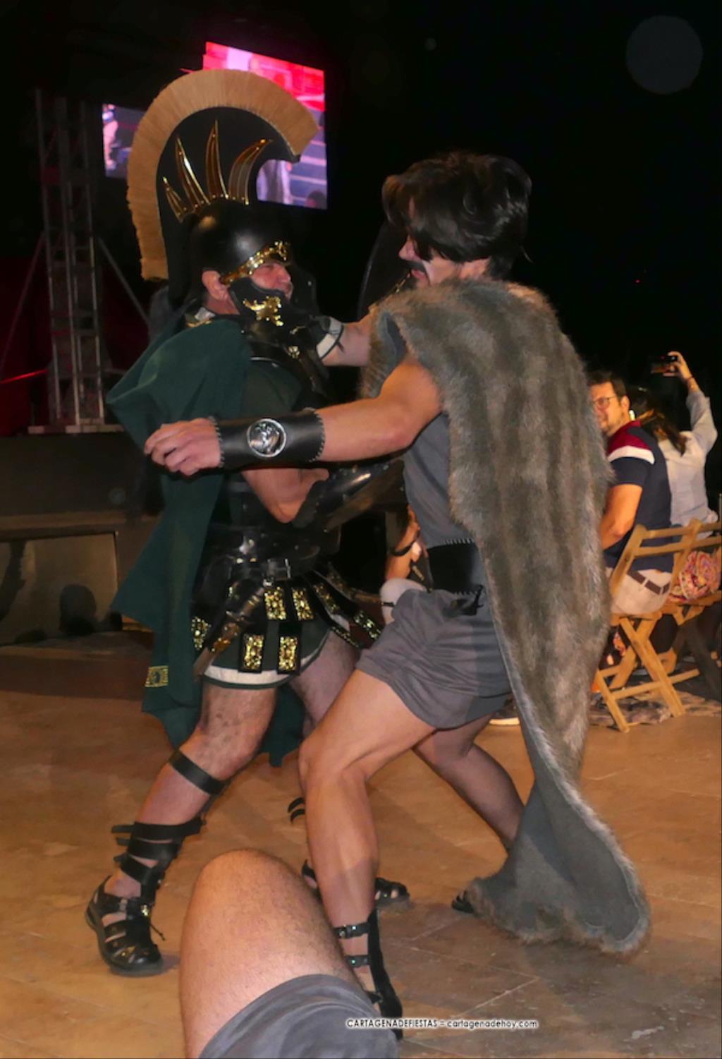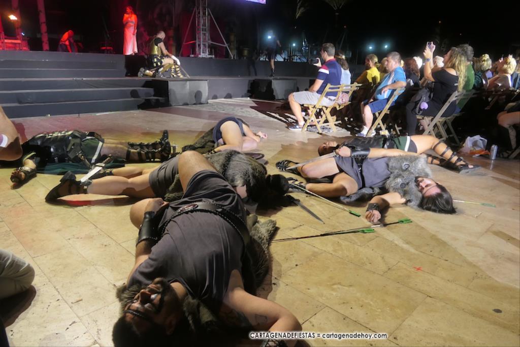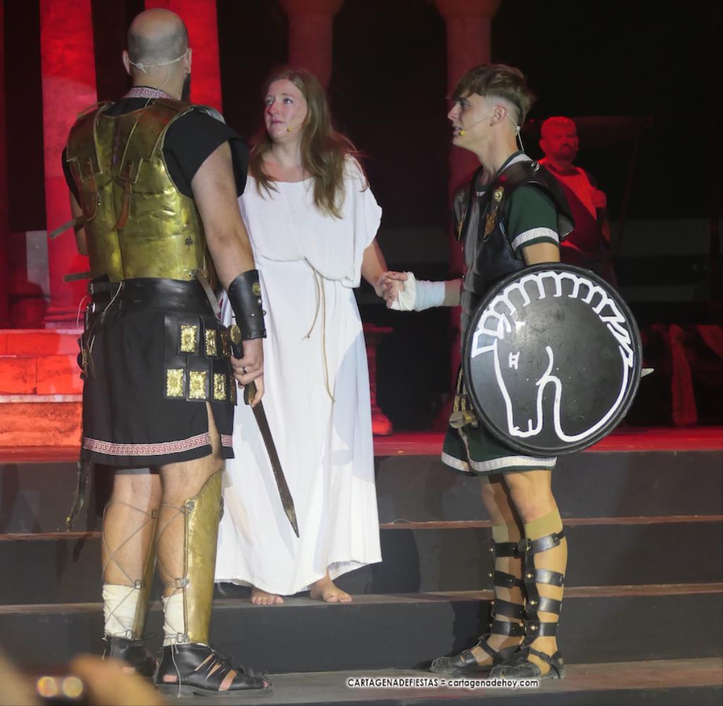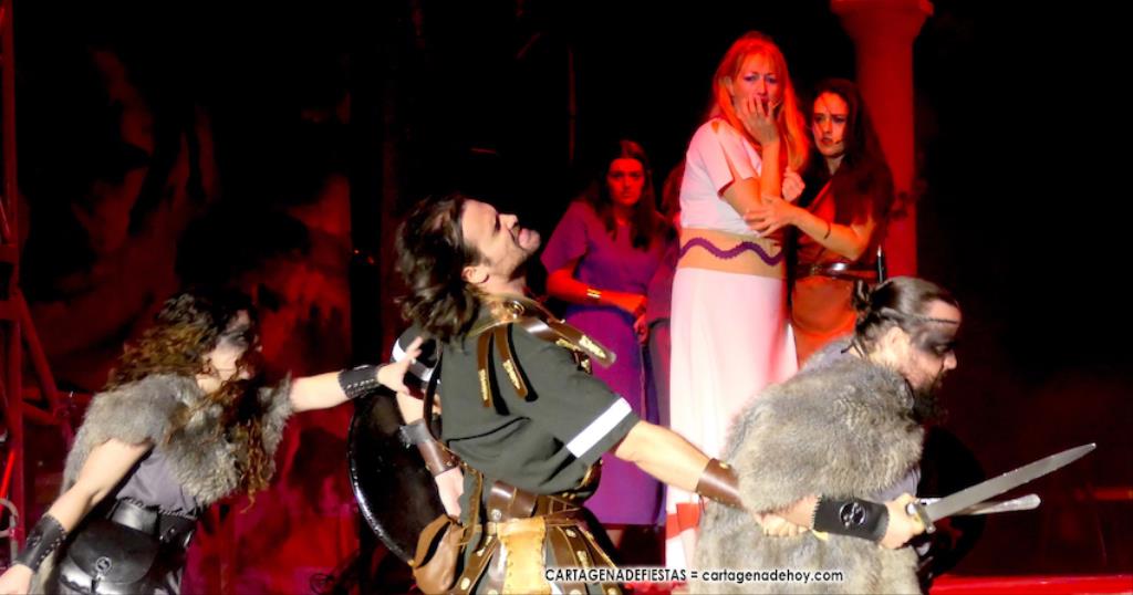 La IA ya está en las históricas fiestas de Cartagena. Su primer acto de presencia (s.e.u.o.), lo ha hecho a través de la representación de la 'Destrucción de Sagunto' con la rockera canción que acompañó al saludo de los actores tras acabar la puesta en escena, que en esta ocasión tuvo, por primera vez también, a Juanjo Núñez con la 'batuta' de dirección, además de interpretar a Valerio (antes Teucro), que este año fue el último legionario en morir.