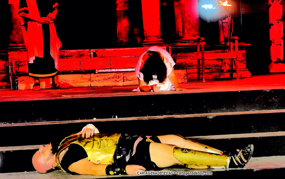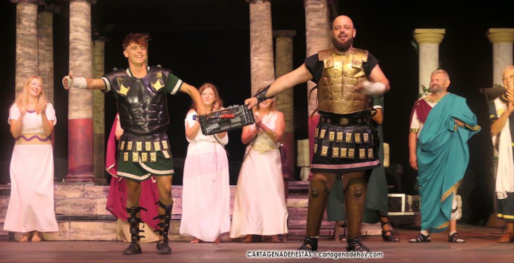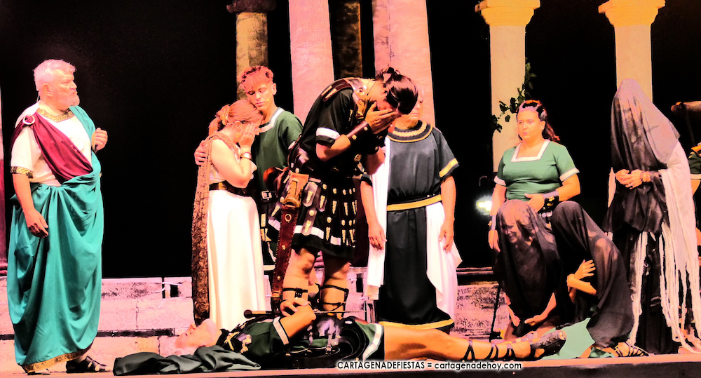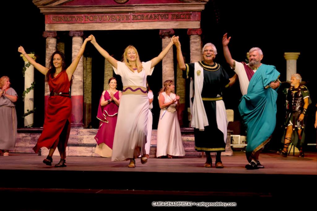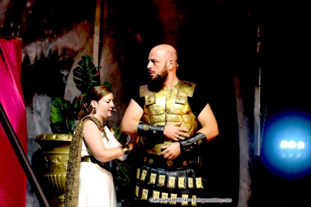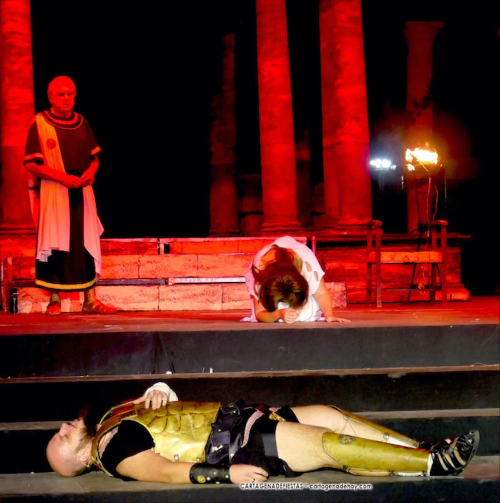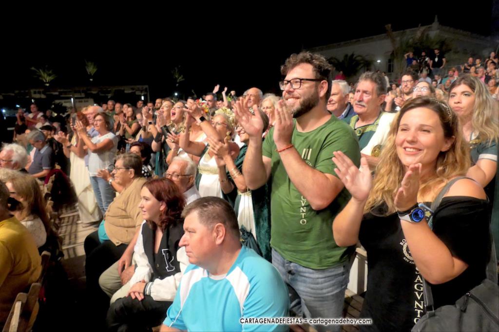 La IA ya está en las históricas fiestas de Cartagena. Su primer acto de presencia (s.e.u.o.), lo ha hecho a través de la representación de la 'Destrucción de Sagunto' con la rockera canción que acompañó al saludo de los actores tras acabar la puesta en escena, que en esta ocasión tuvo, por primera vez también, a Juanjo Núñez con la 'batuta' de dirección, además de interpretar a Valerio (antes Teucro), que este año fue el último legionario en morir.