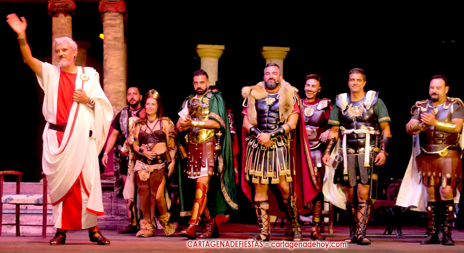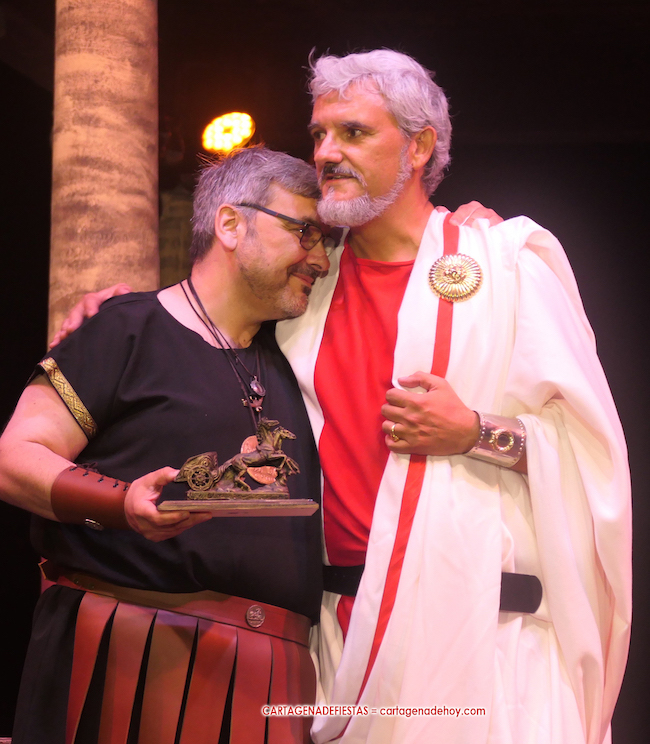 Javier Isbert, como presidente de Senado Romano de las Fiestas de Carthagineses Romanos, subió al escenario el puerto de Cartagena para entregar un trofeo con forma de biga a Jean-Claude Griswold, quien ayer estuvo participando tanto en la 'Destrucción de Sagunto' como en los 'Comicios centuriados'.