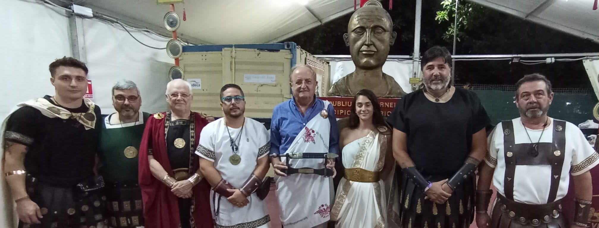 Quien fue presidente de Carthagineses y Romanos en su primera década, además de encarnar a Aníbal, ha recibido, en un acto celebrado en el campamento festero, el galardón que entrega este grupo romano a quienes "han dedicado su esfuerzo a impulsar estas fiestas y, por extensión, a la ciudad de Cartagena", expone el presidente, José Luis Reverte.