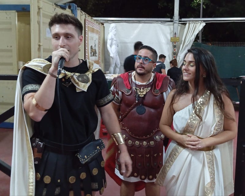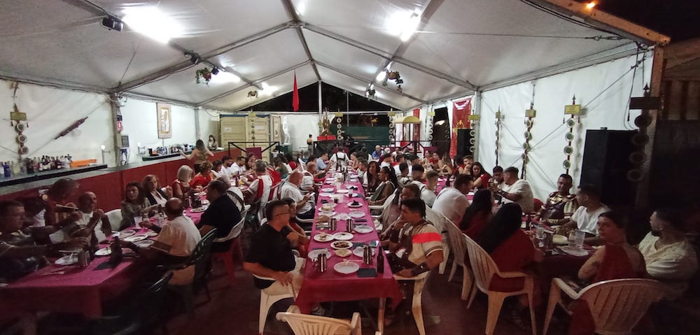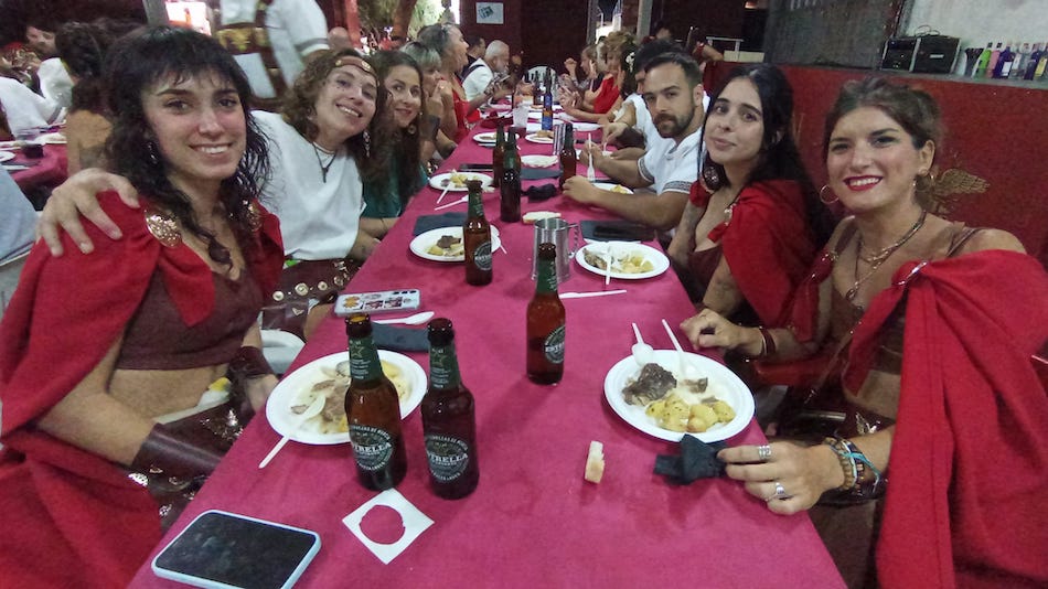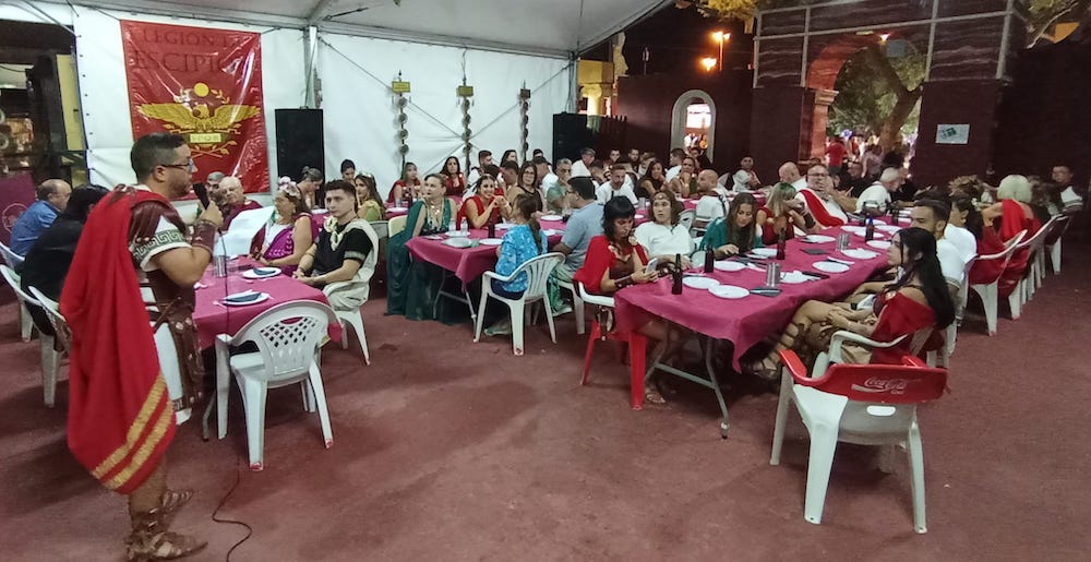 Asimismo, la cena también ha contado con la presencia de Eulogio, quien encarna al Pretor Marco Juno Silano y de Sonia Agüera, que representa a la Diosa Ceres, diosa romana de la agricultura, del crecimiento de las plantas y de las buenas cosechas. Es por ello por lo que la palabra “cereal” viene del nombre de esta diosa.