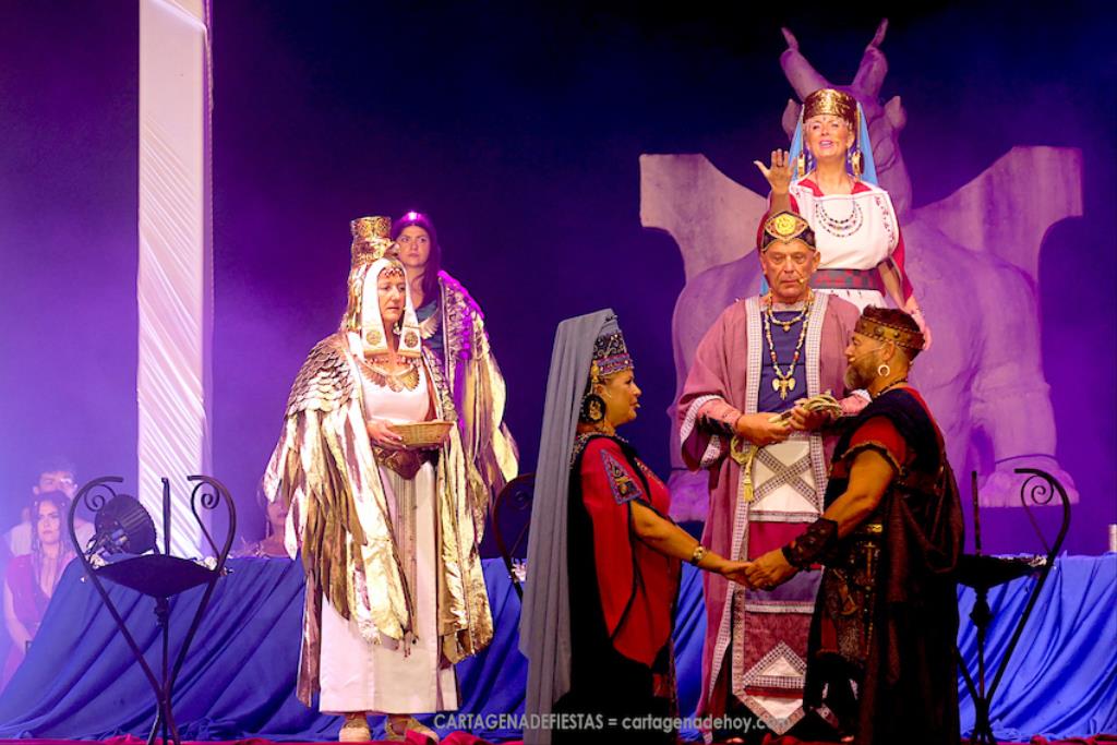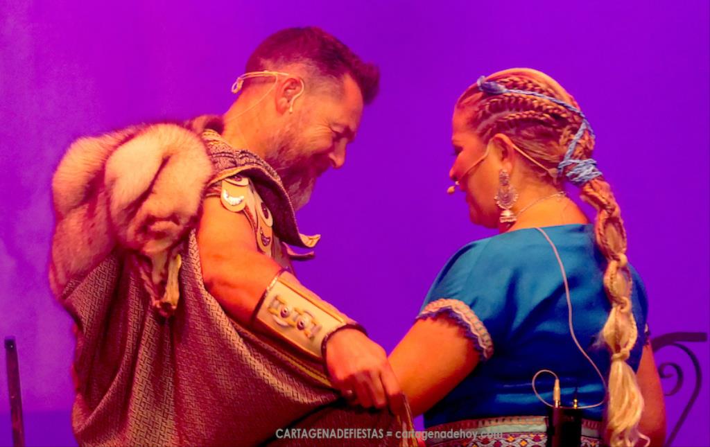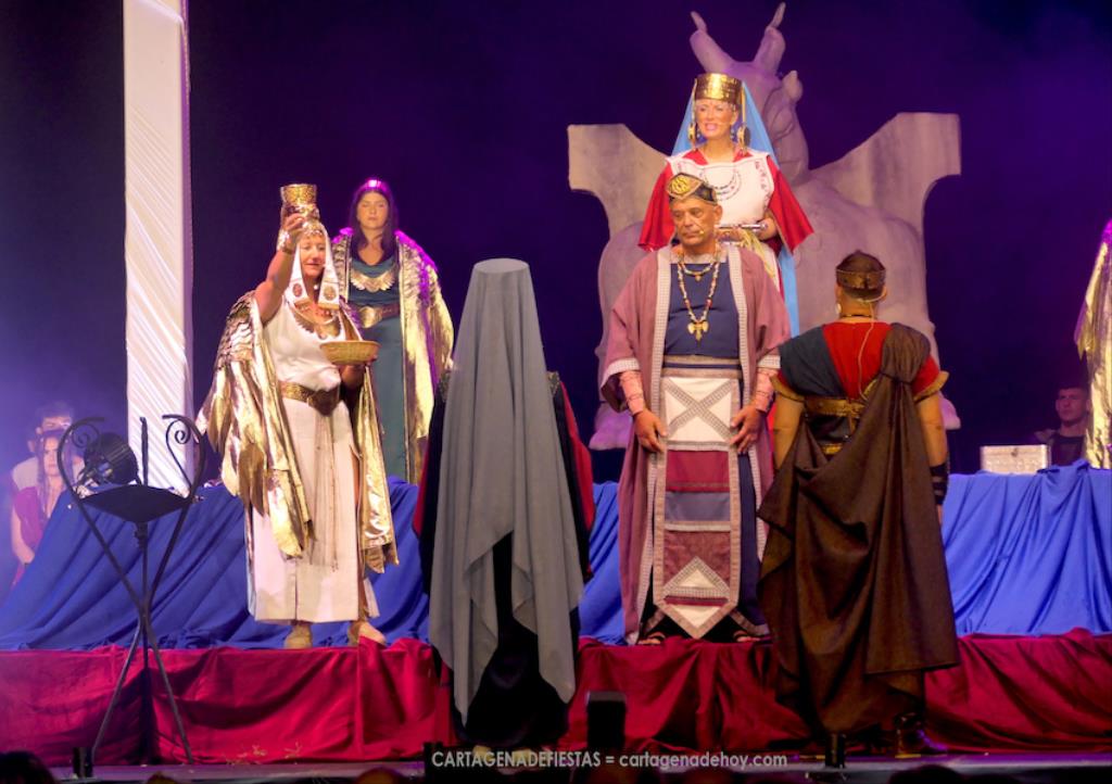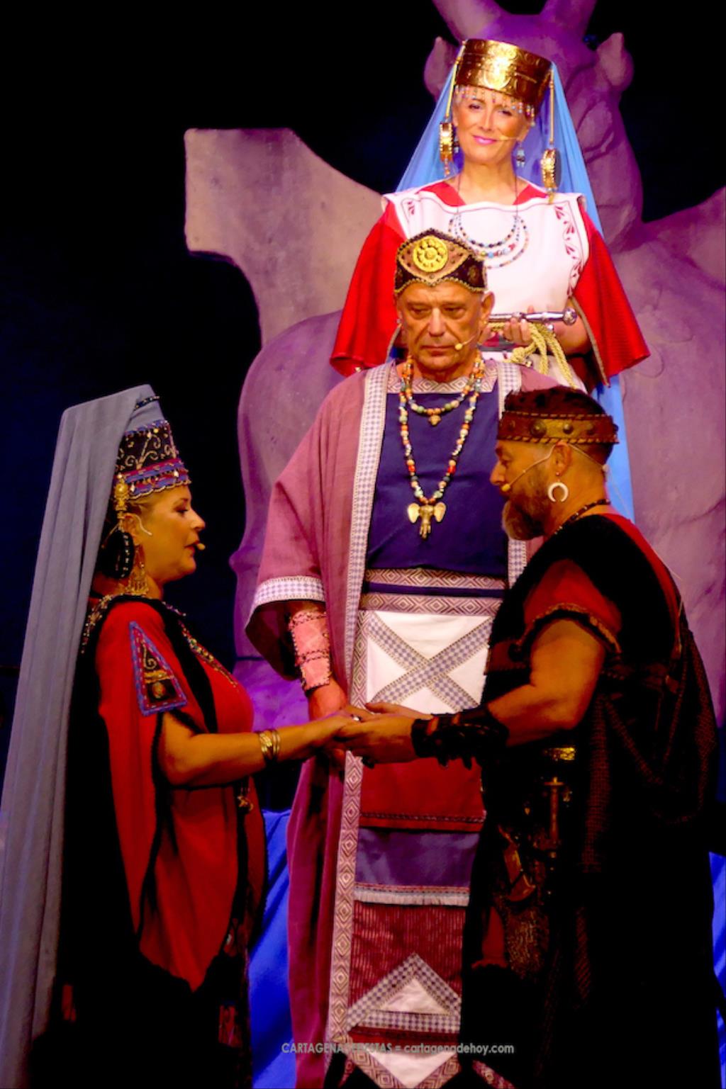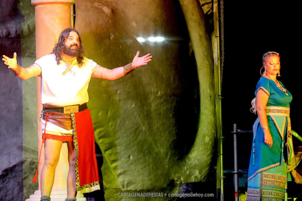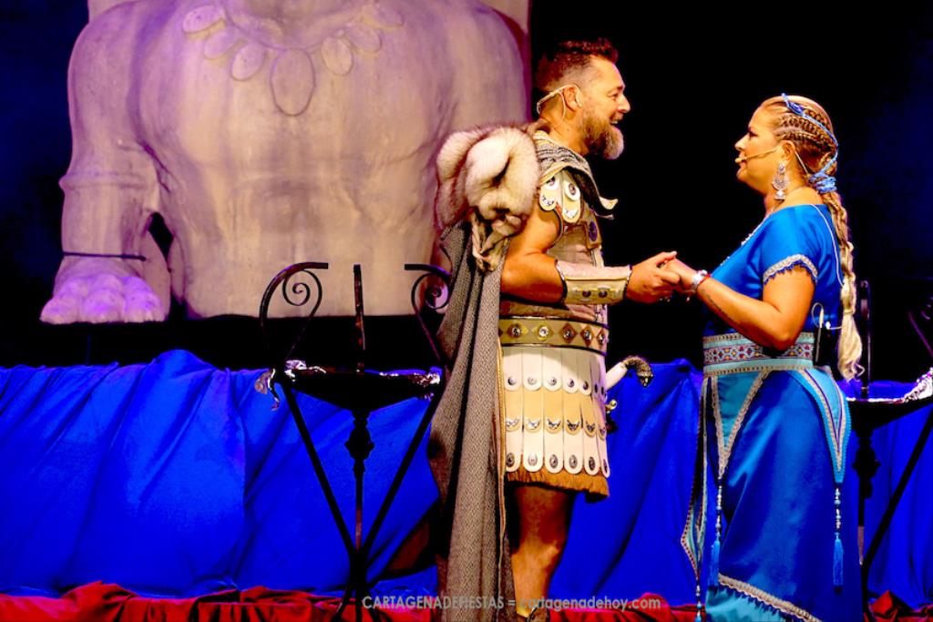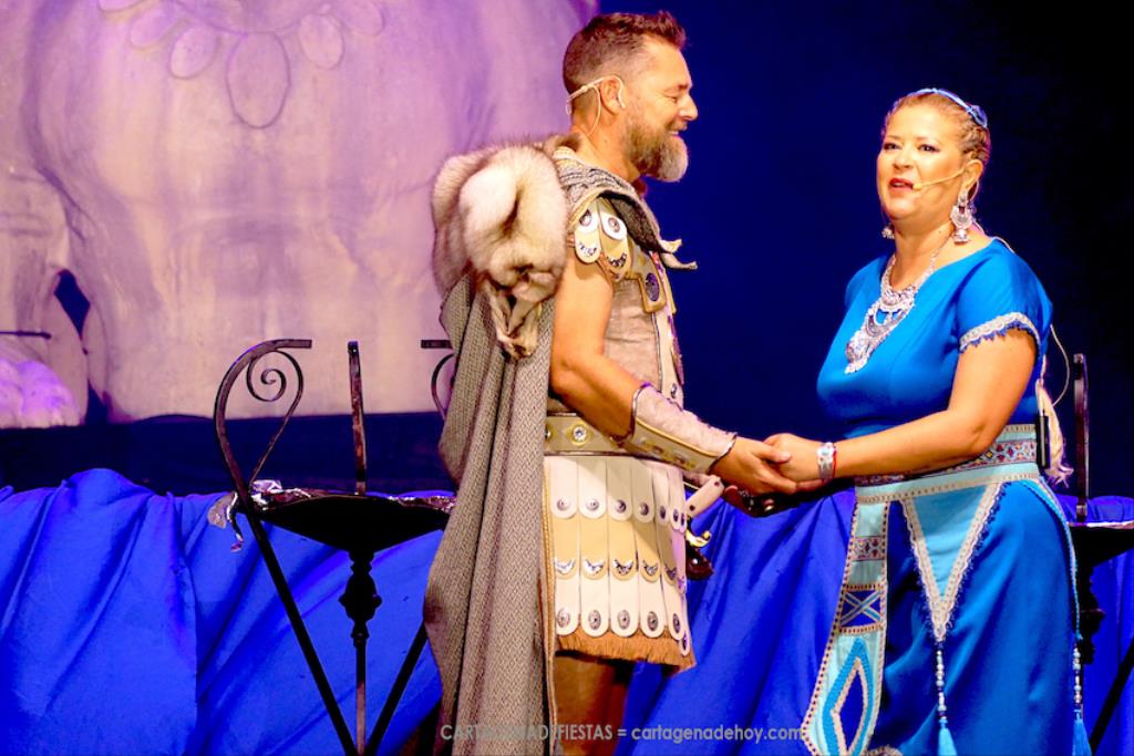Julio Guillamón y Esther Escolar volvieron a lucir la fuerte química que existe entre ambos. La diferencia que hace un años, cuando se estrenaron en estos papeles, es que entonces estaba la presión del estreno y ahora ha sido puro disfrute, que es lo mejor en la despedida, pues el próximo año les toca a nuevos festeros. Es más, una muestra de esa felicidad que tenía estuvo en el cierre del acto, cuando Aníbal anuncia 3 días de fiestas y dispendios. Julio los amplió este año a 7 para "danzad, saltad y bailad", como pidió Himilce, a lo que se suma el tercer beso entre ambos de la noche.