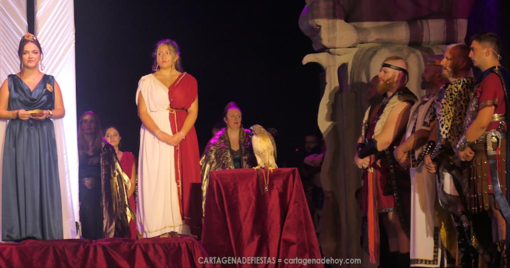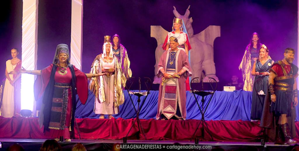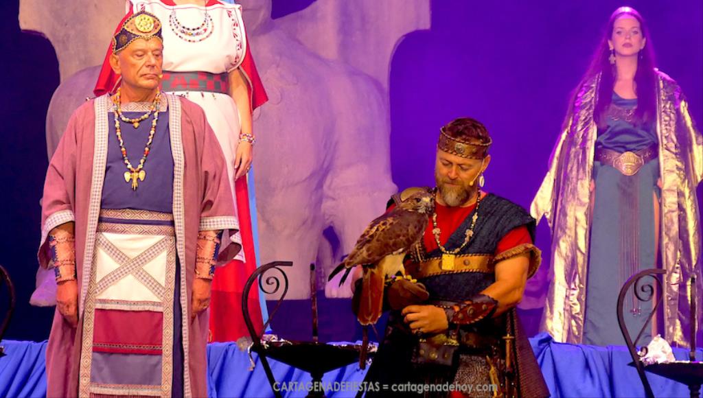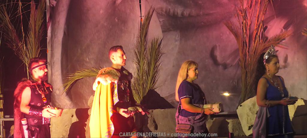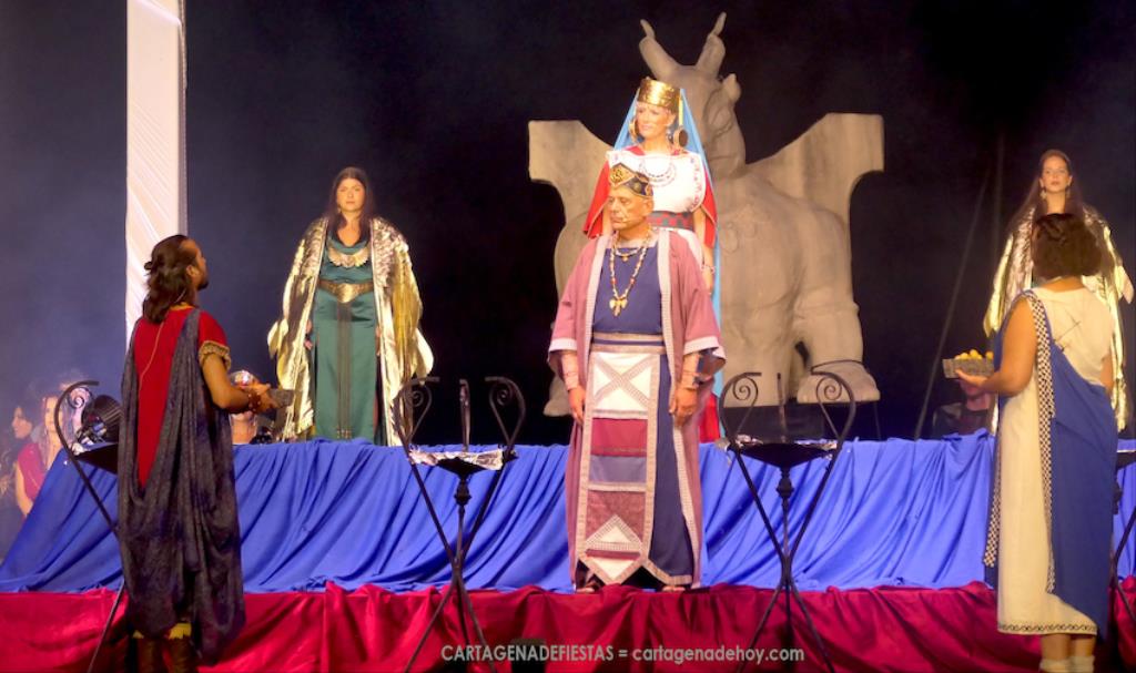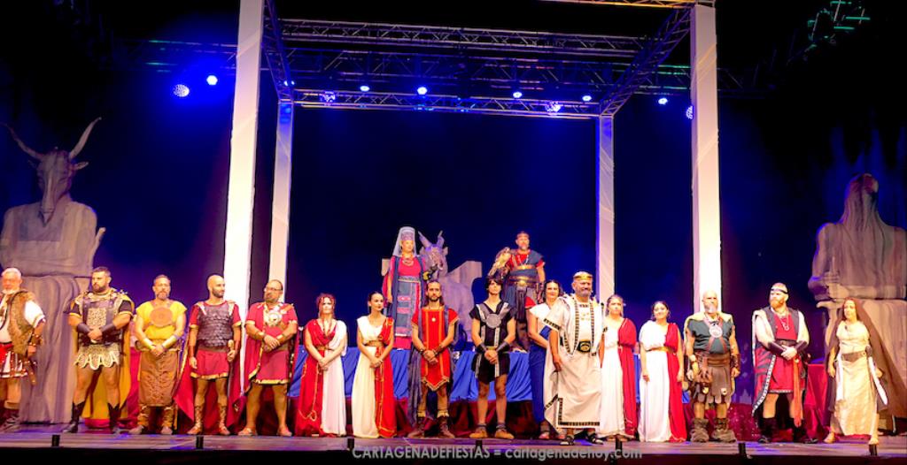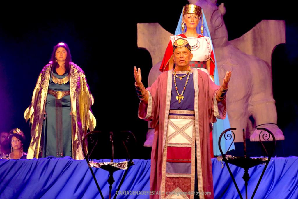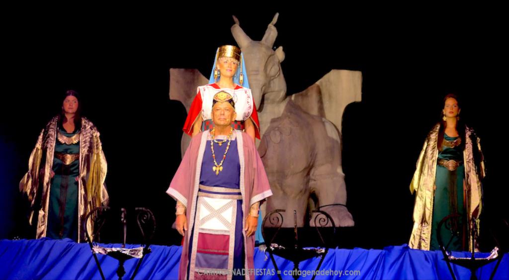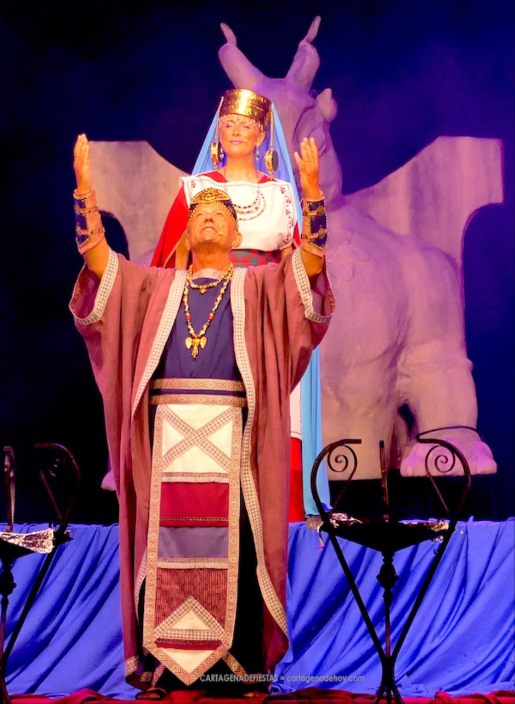 Julio Guillamón y Esther Escolar volvieron a lucir la fuerte química que existe entre ambos. La diferencia que hace un años, cuando se estrenaron en estos papeles, es que entonces estaba la presión del estreno y ahora ha sido puro disfrute, que es lo mejor en la despedida, pues el próximo año les toca a nuevos festeros. Es más, una muestra de esa felicidad que tenía estuvo en el cierre del acto, cuando Aníbal anuncia 3 días de fiestas y dispendios. Julio los amplió este año a 7 para "danzad, saltad y bailad", como pidió Himilce, a lo que se suma el tercer beso entre ambos de la noche.