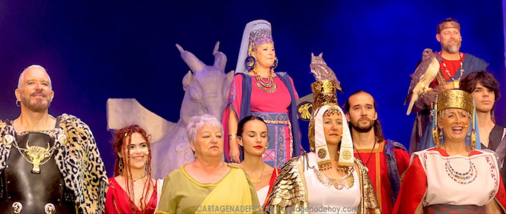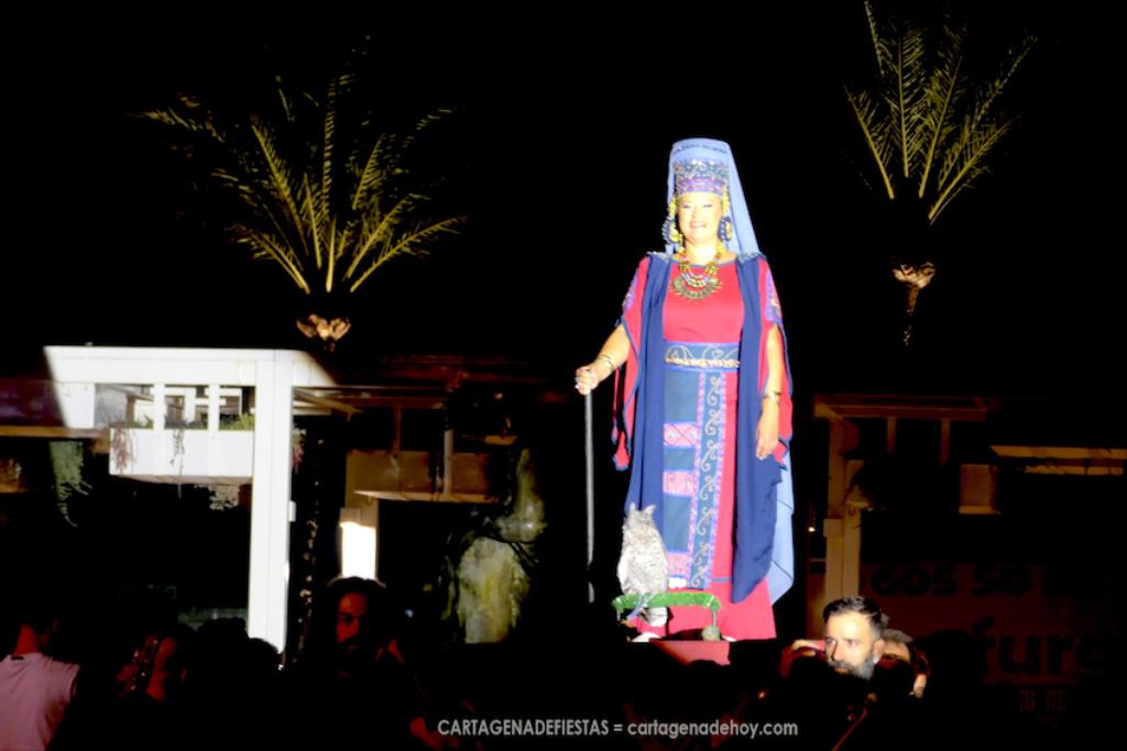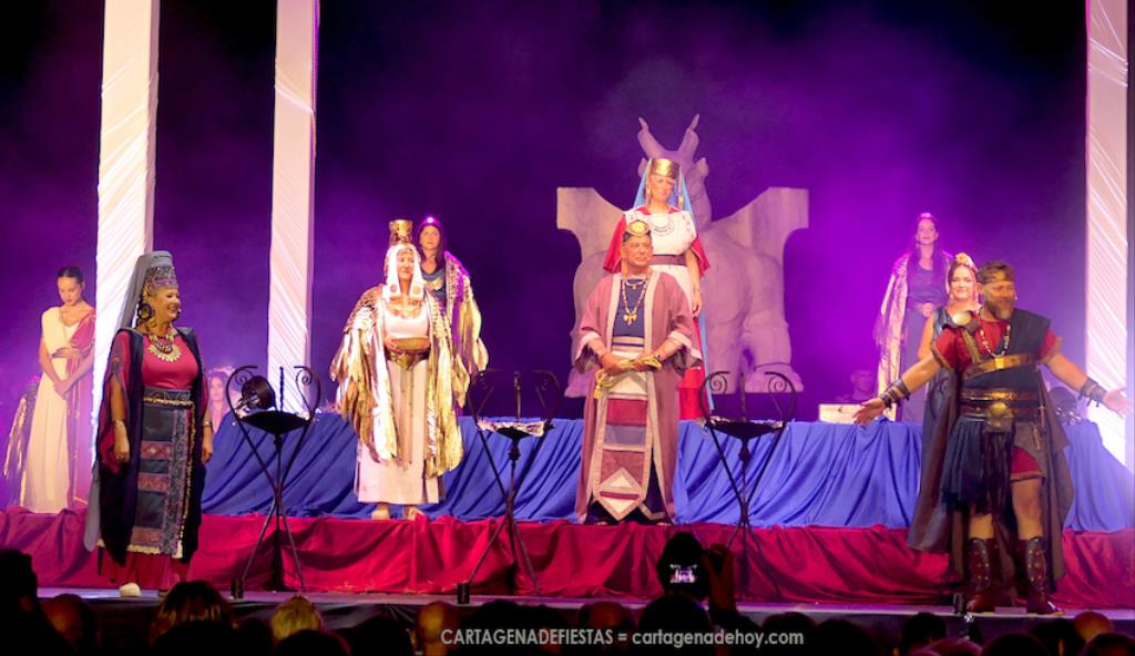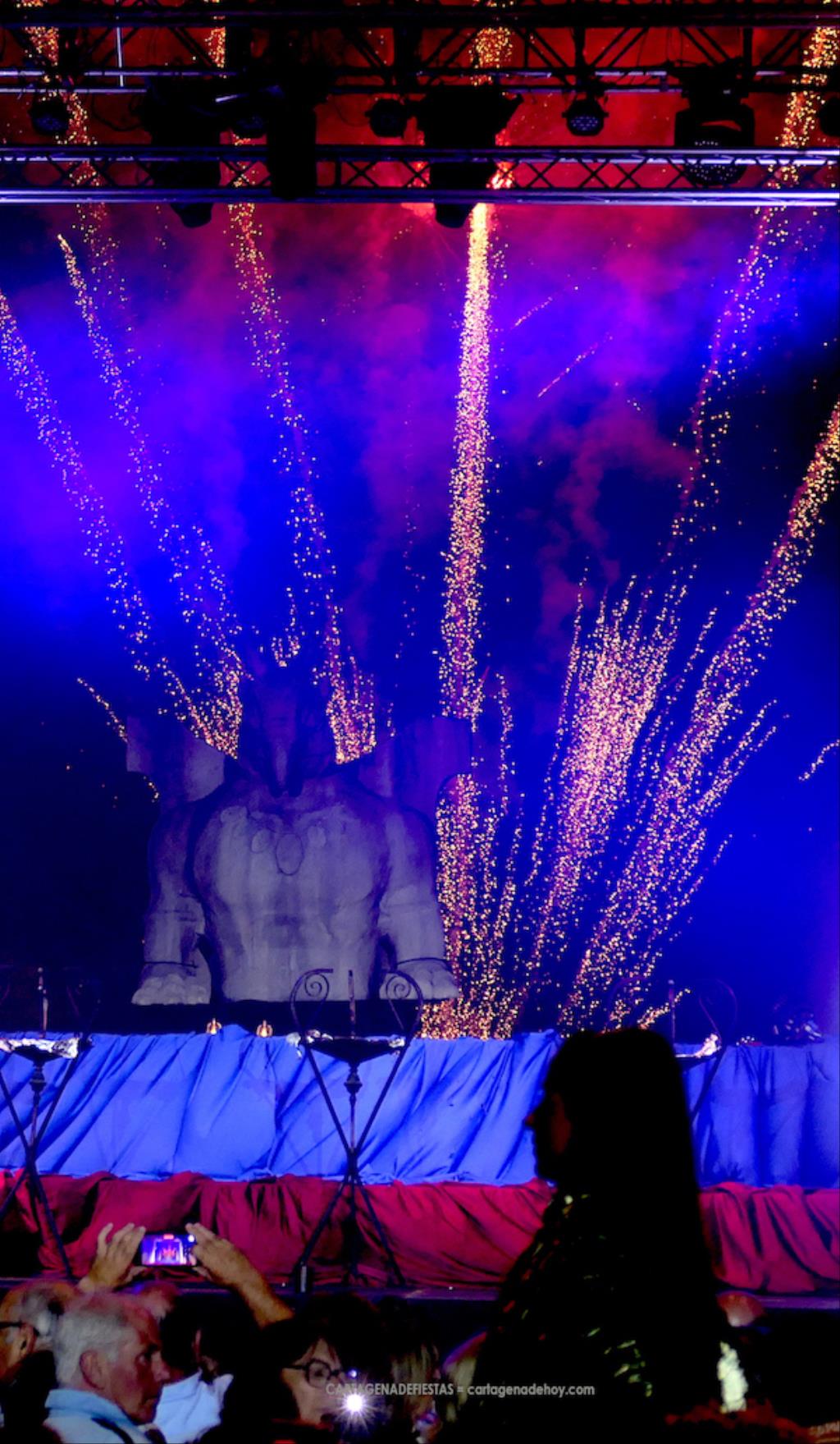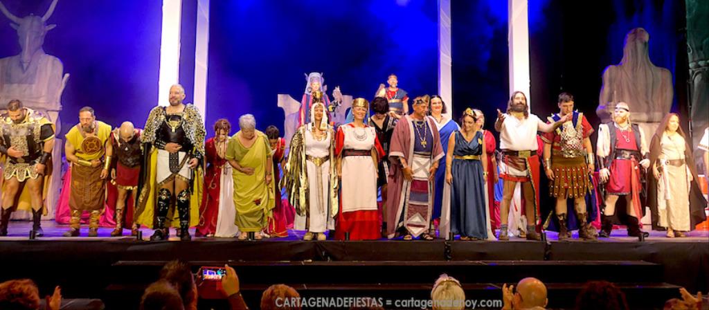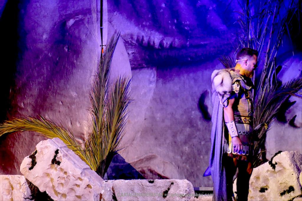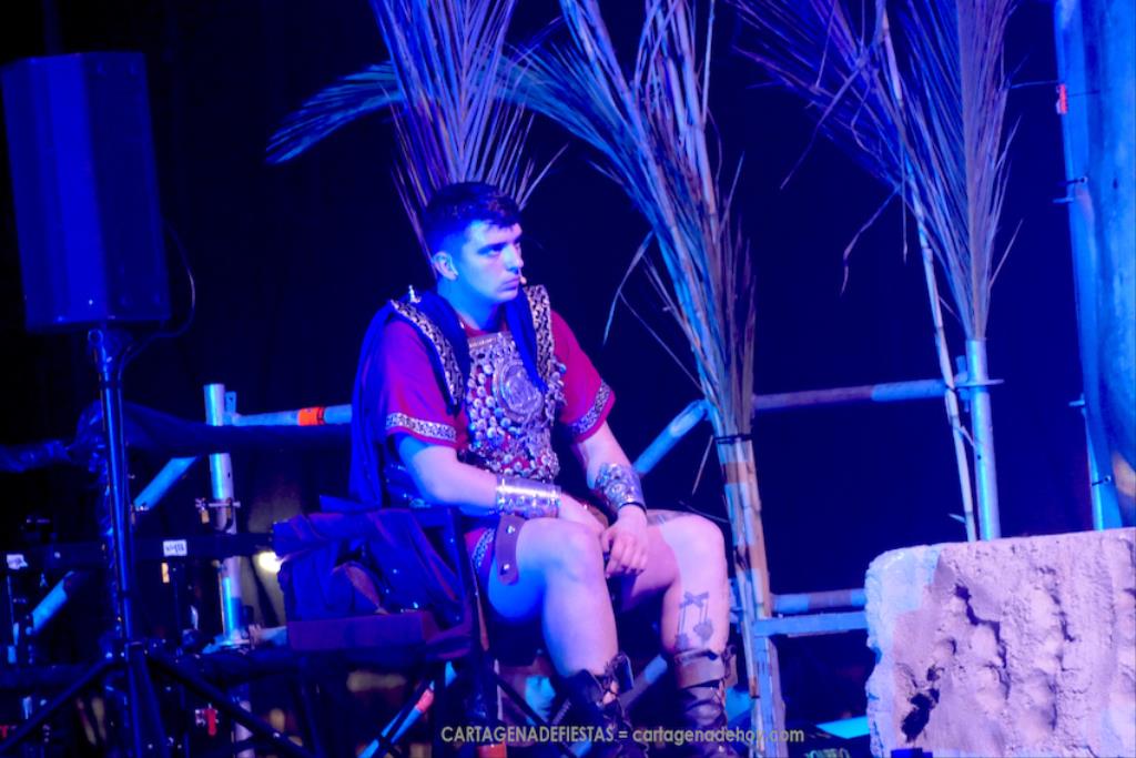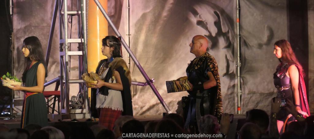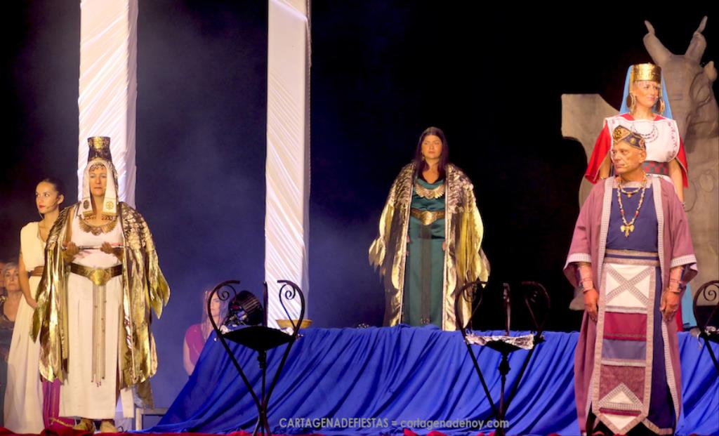 Julio Guillamón y Esther Escolar volvieron a lucir la fuerte química que existe entre ambos. La diferencia que hace un años, cuando se estrenaron en estos papeles, es que entonces estaba la presión del estreno y ahora ha sido puro disfrute, que es lo mejor en la despedida, pues el próximo año les toca a nuevos festeros. Es más, una muestra de esa felicidad que tenía estuvo en el cierre del acto, cuando Aníbal anuncia 3 días de fiestas y dispendios. Julio los amplió este año a 7 para "danzad, saltad y bailad", como pidió Himilce, a lo que se suma el tercer beso entre ambos de la noche.