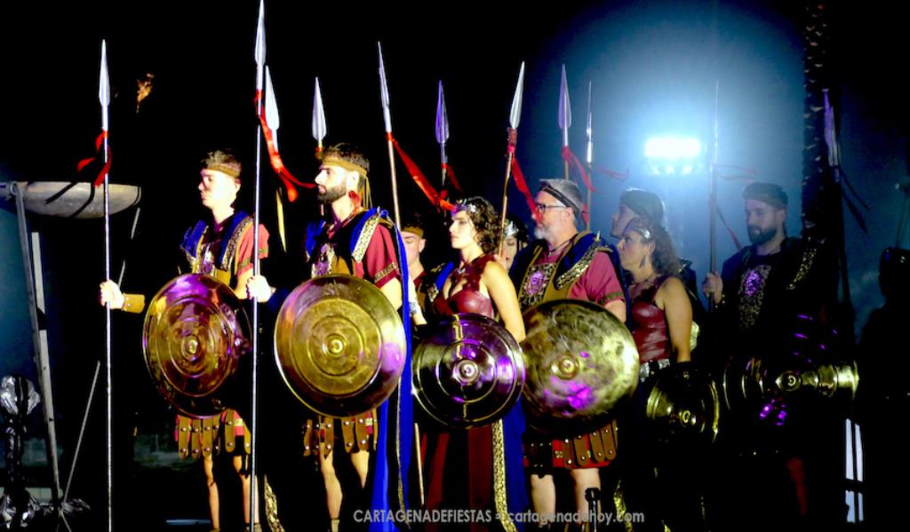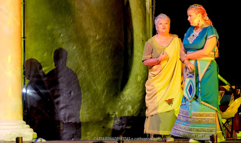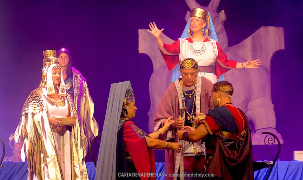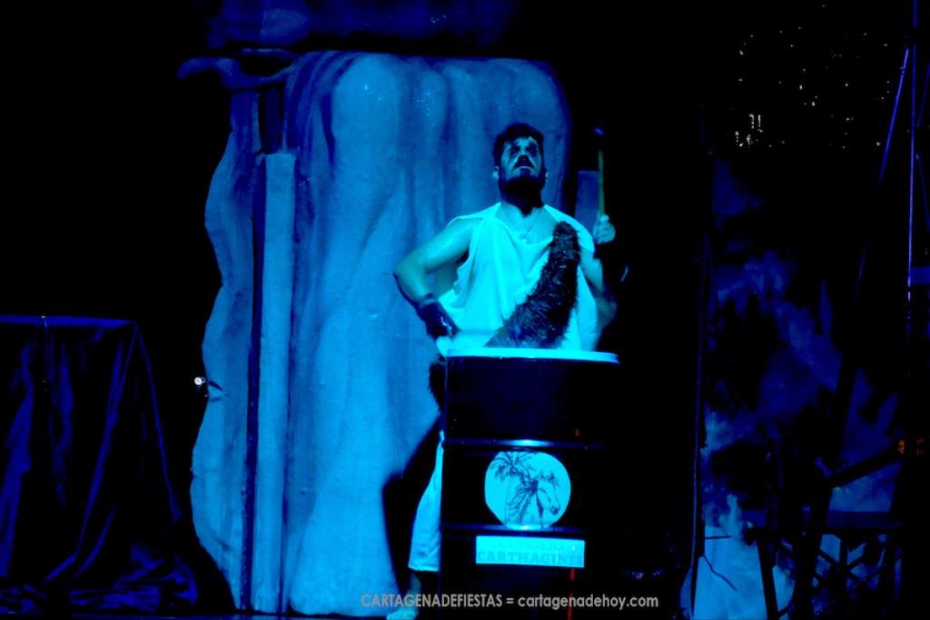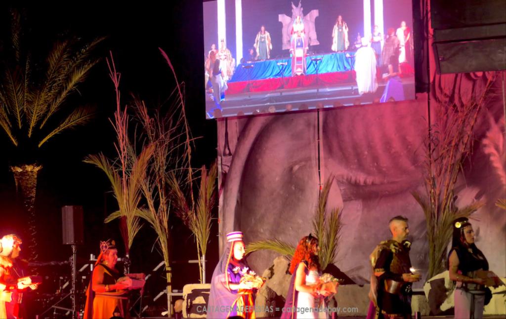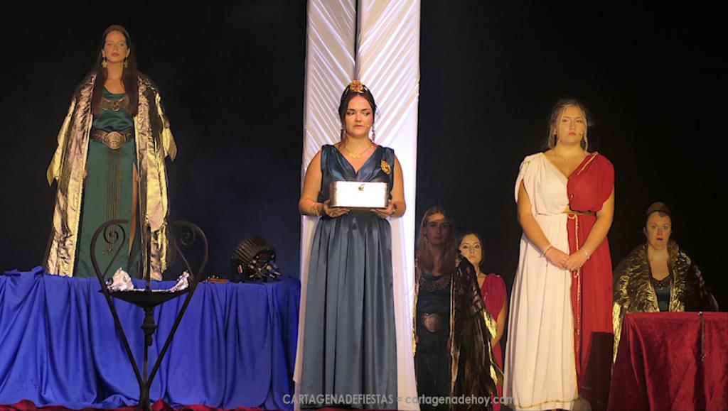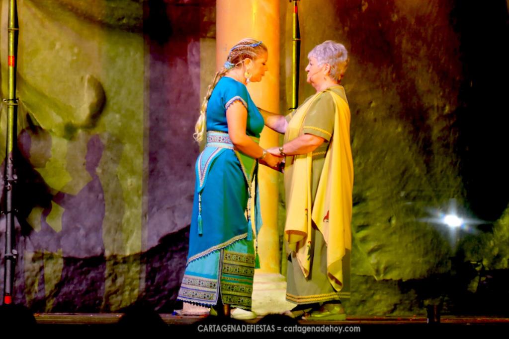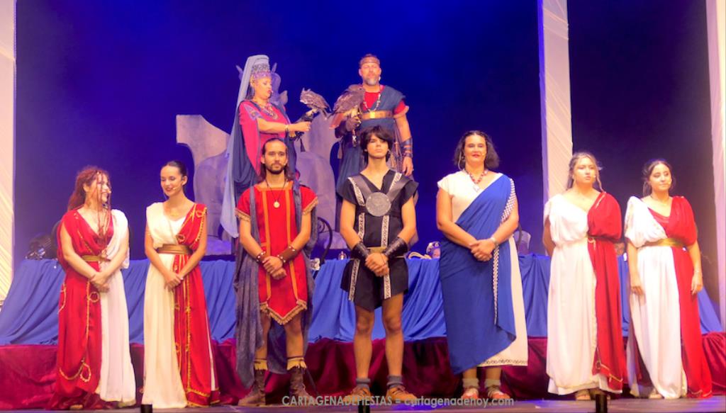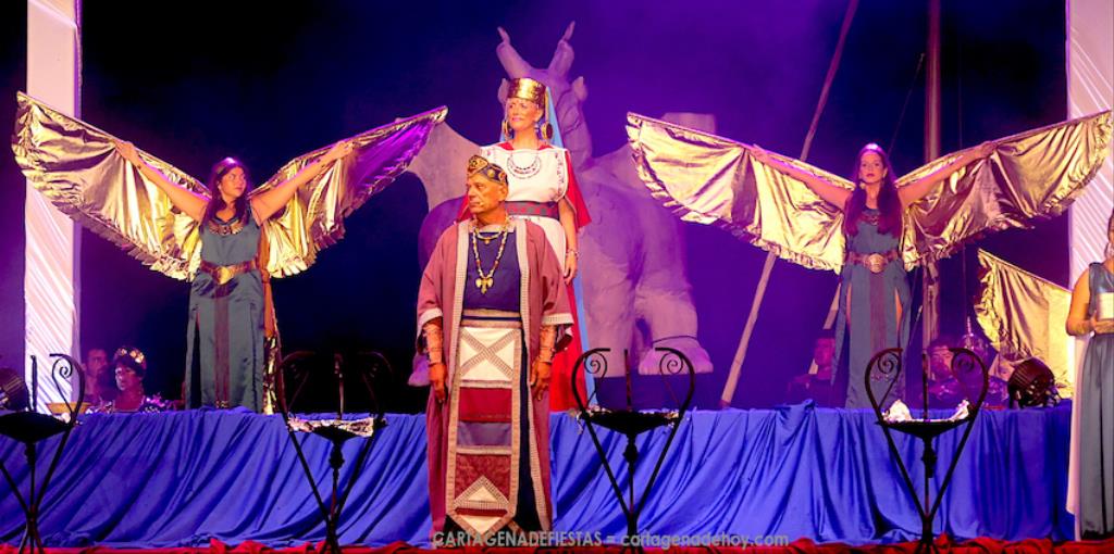 Julio Guillamón y Esther Escolar volvieron a lucir la fuerte química que existe entre ambos. La diferencia que hace un años, cuando se estrenaron en estos papeles, es que entonces estaba la presión del estreno y ahora ha sido puro disfrute, que es lo mejor en la despedida, pues el próximo año les toca a nuevos festeros. Es más, una muestra de esa felicidad que tenía estuvo en el cierre del acto, cuando Aníbal anuncia 3 días de fiestas y dispendios. Julio los amplió este año a 7 para "danzad, saltad y bailad", como pidió Himilce, a lo que se suma el tercer beso entre ambos de la noche.