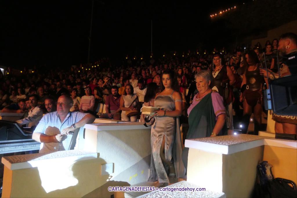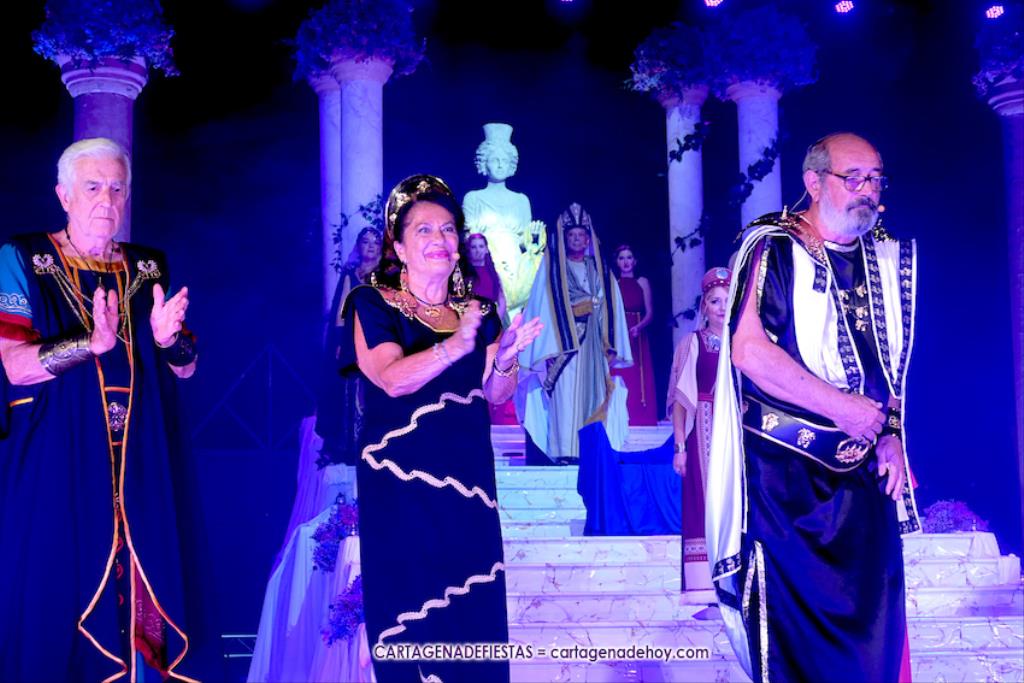 En el epílogo, ya fuera de la obra y tras los saludas del reparto de actores-festeros, Honderos Baleares ha entregado una daga y un ramo de flores a una emocionada Esther Escolar, compañera de tropa y que este día concluye su faceta teatral como principal personaje femenino carthaginés, en gratitud a su buenhacer como Himílce durante los años 2023 y 2024.
