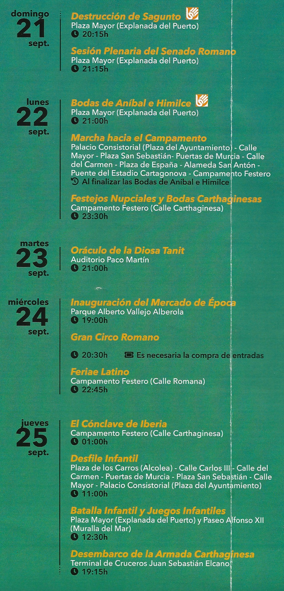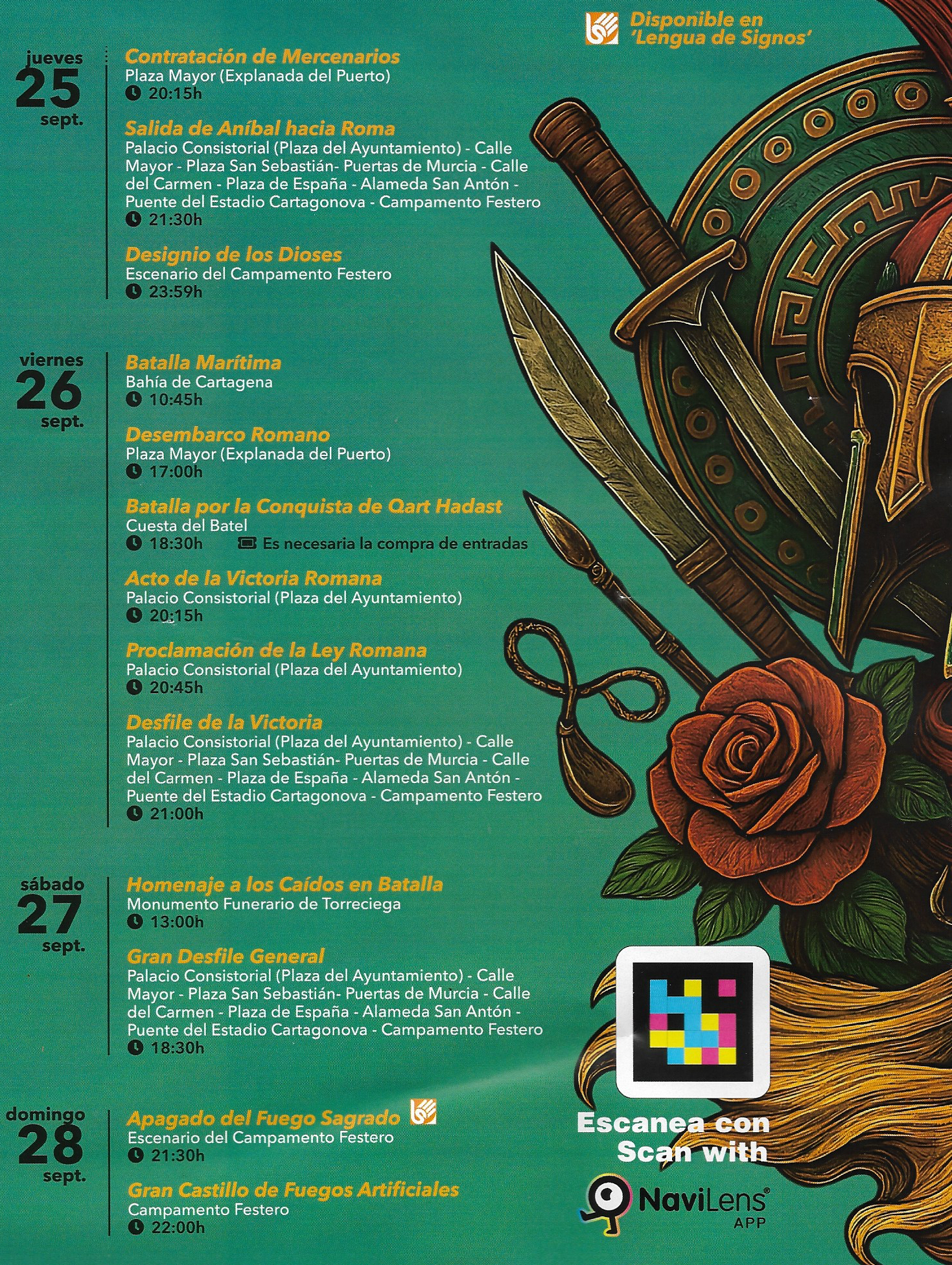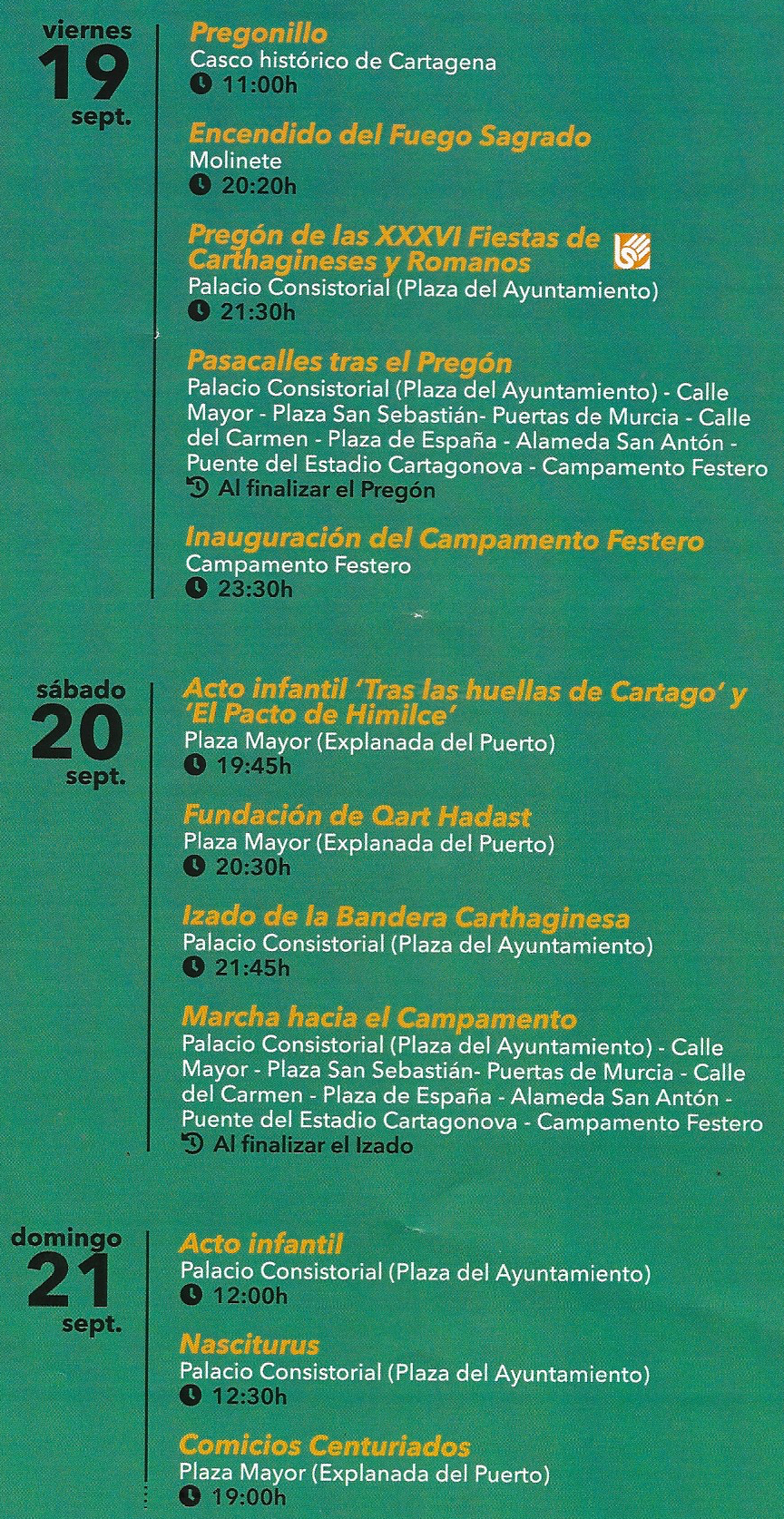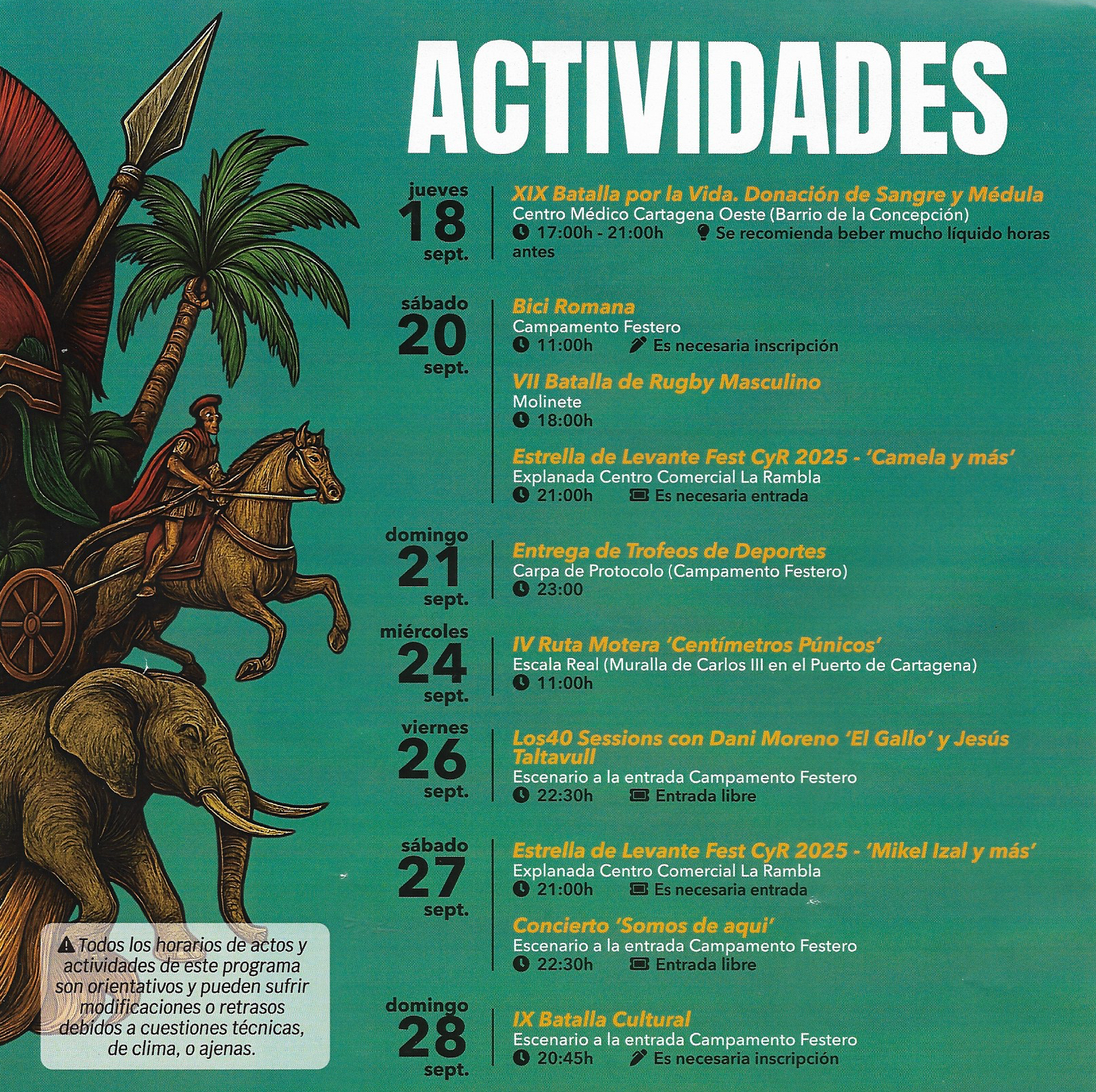 Ofrecemos fechas y horarios de los actos oficiales y actividades de las Fiestas de Carthagineses y Romanos del 19 al 28 de septiembre, que está a expensas de si el gran espectáculo romano irá a la Cuesta del Batel o al estadio Cartagonova, siendo novedad que todos los actos serán transmitidos por Youtube con traductor de signos. El 'Designio de los dioses' (foto adjunta) regresa al campamento.