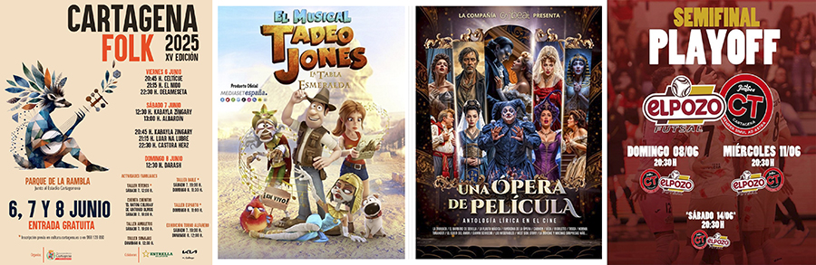 La agenda del fin de semana suena con los conciertos gratuitos Cartagena Folk hasta el domingo 8 de junio. El festival programa un sinfín de actuaciones y actividades de ocio para toda la familia en el parque de La Rambla, junto al Estadio Cartagonova. Se desarrolla viernes por la tarde-noche. Sábado todo el día y domingo por la mañana. Actúan Celtícue, El Nido, Delameseta, Kabayla Zíngary, H. Albardin, Luar Na Lubre, Castora Herz y Darash. Entre las actividades hay cuentacuentos, exhibición de alfarería, y talleres de amuletos, baile, títeres y sonajas.