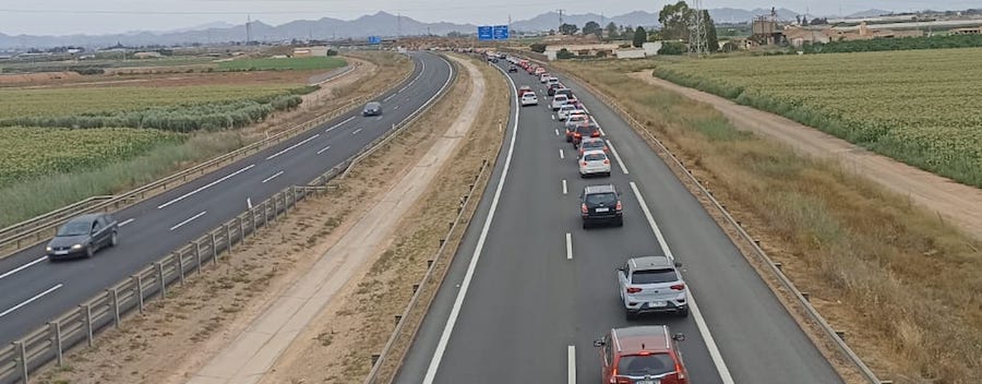 El largo fin de semana del 'Día de la Región de Murcia' ha llevado a nuestras playas a miles de personas, lo que ha generado el regreso de las tradicionales retenciones de vehículos, como muestran las fotografías de ayer tarde (cuando comenzaba a caer el sol) en el regreso, para tomar la salida hacia Murcia por la A30.
