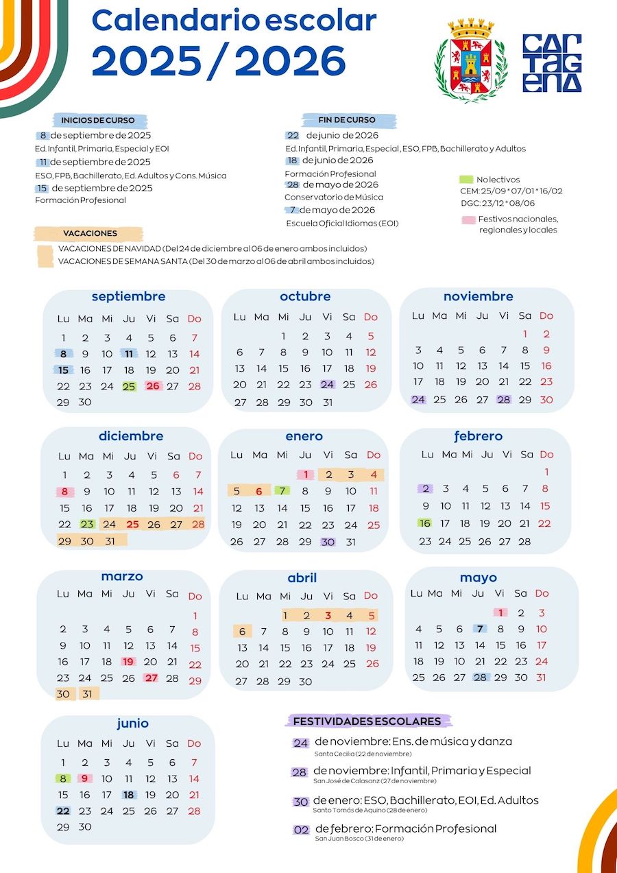 Publicado el calendario escolar de Cartagena para el curso 25/26. El inicio del curso tiene lugar el 8 de septiembre en Infantil, Primaria, Especial y EOI. El 11 de Septiembre en ESO, FPB, Bachillerato, Adultos y Conservatorio de Música. Y 15 de septiembre en Formación Profesional.