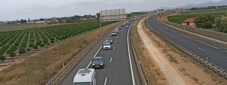 El largo fin de semana del 'Día de la Región de Murcia' ha llevado a nuestras playas a miles de personas, lo que ha generado el regreso de las tradicionales retenciones de vehículos, como muestran las fotografías de ayer tarde (cuando comenzaba a caer el sol) en el regreso, para tomar la salida hacia Murcia por la A30.