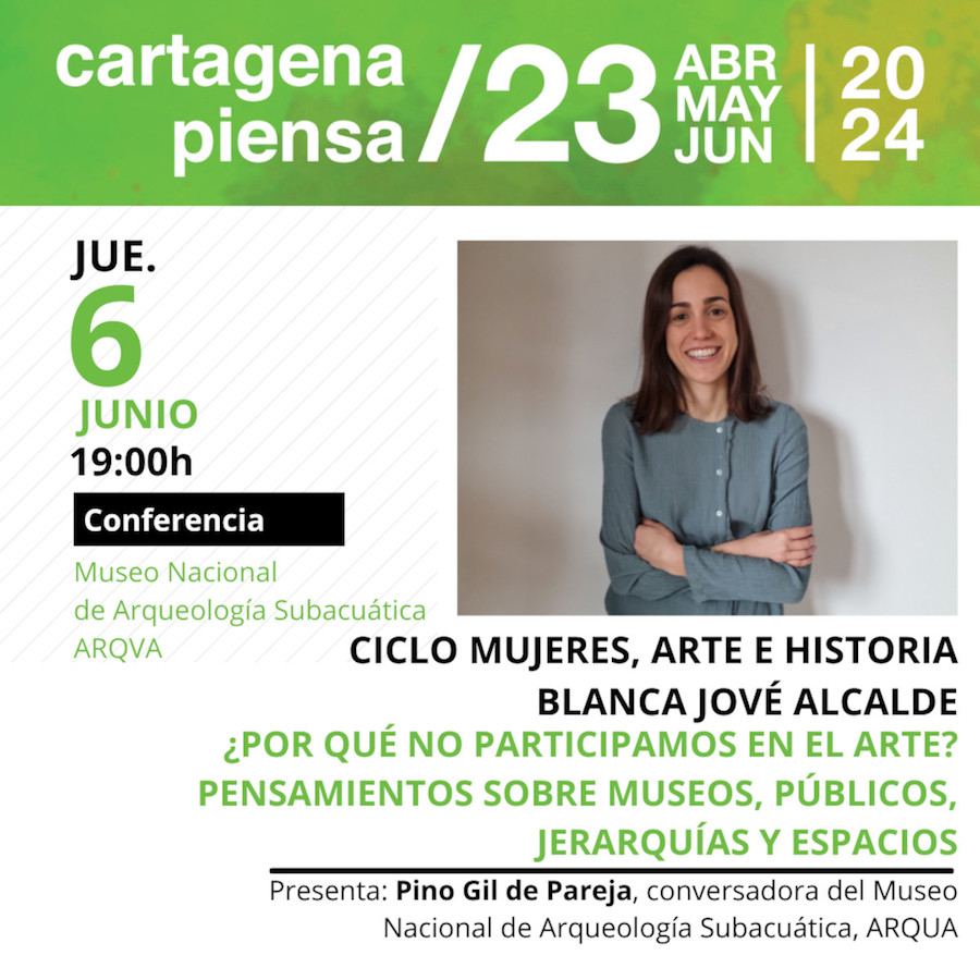 El programa 'Cartagena piensa', que organiza el departamento municipal de Cultura, trae hoy a Blanca Jové Alcalde al ciclo 'Mujeres, arte e historia', con la conferencia '¿Por qué no participamos en el arte? Pensamientos sobre museos, públicos, jerarquías y espacios', que tendrá lugar a las 19 horas en el ARQVA.