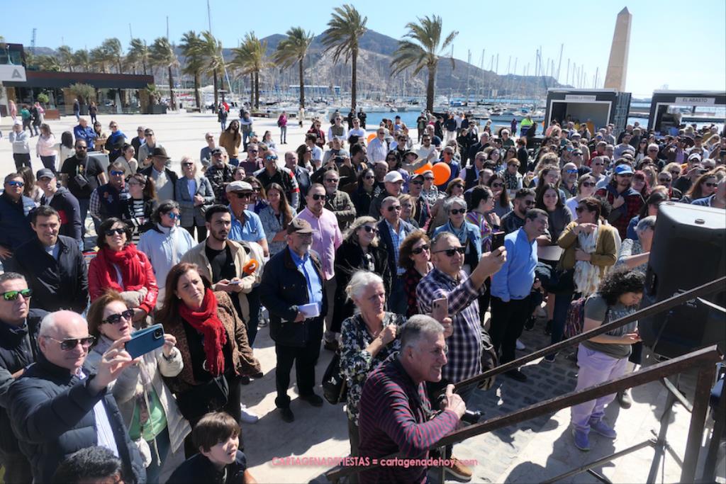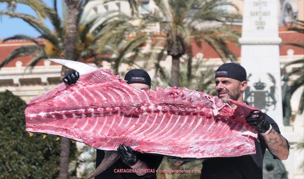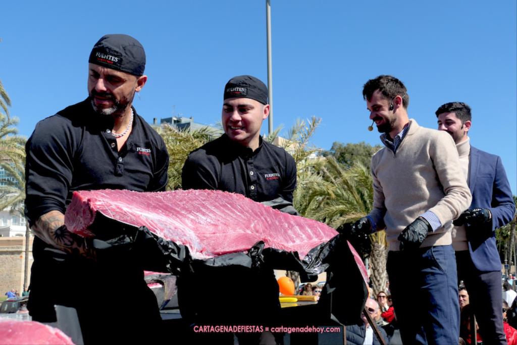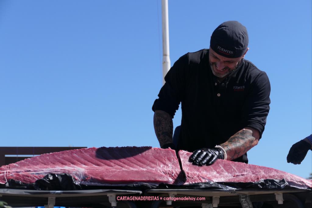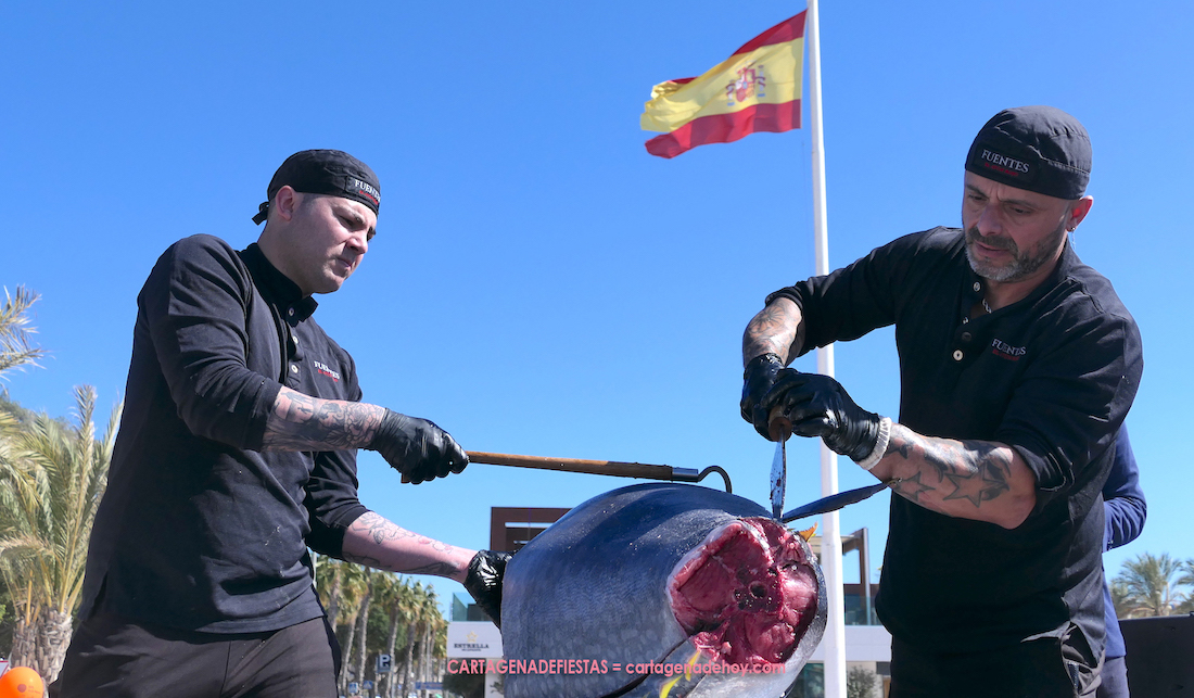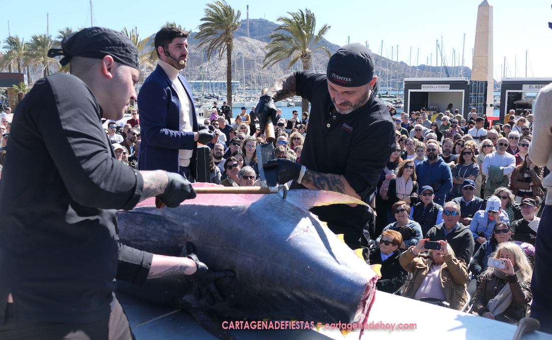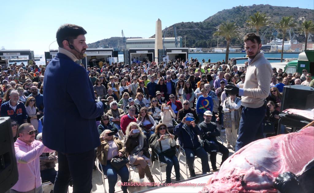 El arte del despiece del gran pez ha atraído la mirada de decenas de personas esta mañana en la explanada del puerto, dentro de los actos de las 'Jornadas gastronómicas de sol en sol' celebradas con motivo de que Cartagena es la anfitriona de la 'Gala de los Soles Repsol'.
