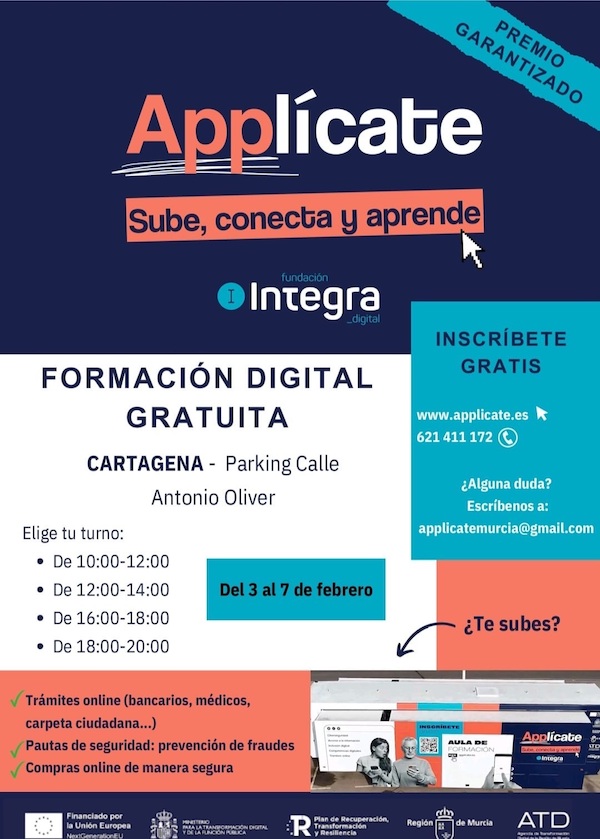 La campaña itinerante “Applícate. Sube, conecta y aprende” está promovida por la Fundación Integra Digital y el Gobierno de la Región de Murcia, y cuenta con la financiación de los Fondos Europeos Next Generation. Inscripciones en la secretaría de la Asociación de Vecinos Ciudad Jardín.