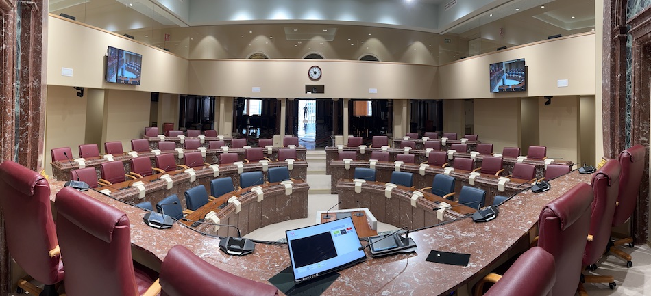 Además de la sustitución de los revestimientos de paredes y suelo, la renovación del Salón de Plenos incluye la instalación de un nuevo sistema de conferencias, de un sistema de votación electrónica y de un sistema de visualización y de gestión y control de sesiones. También se han instalado puntos de red y usb para la implementación de teléfonos IP en los escaños y la mesa presidencial, proporcionando conexión a datos mediante un sistema de cableado estructurado y alimentación a través de PoE.