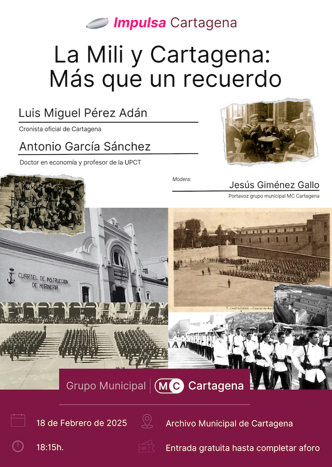 Para desgranar la importancia de la mili para la ciudad y el municipio, la nueva edición de ‘Impulsa Cartagena’ contará con la participación de Luis Miguel Pérez Adán, cronista oficial de Cartagena; y Antonio García Sánchez, doctor en Economía y profesor de la UPCT. Además, contará con la moderación de Jesús Giménez Gallo, portavoz del grupo municipal MC Cartagena.