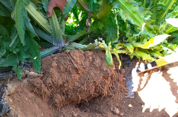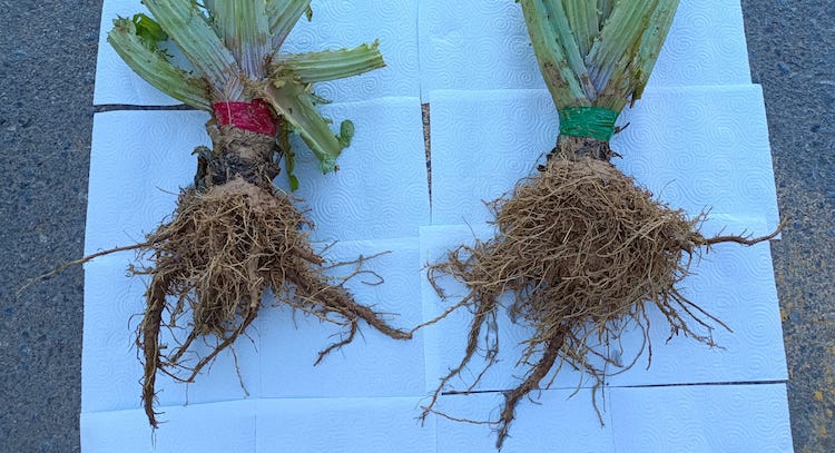 El uso de carbón vegetal es rentable económicamente y compatible con la agricultura ecológica, resalta el Trabajo Fin de Grado de un estudiante de Ingeniería Agronómica llevado a cabo con cultivos de alcachofa. Imágenes adjuntas de los ensayos, donde se aprecia el crecimiento de las raíces con fertilizantes inorgánicos (rojo) y con carbón vegetal (verde).