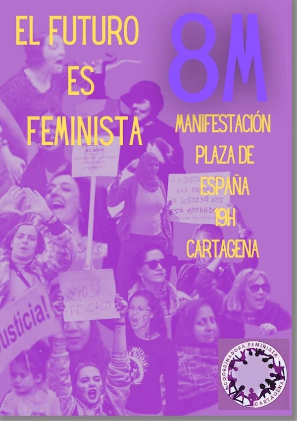 La asociación de vecinos de 'Las Seiscientas' informa que este viernes, a las 17 horas, se leerá un manifiesto con motivo del 'Día internacional de la mujer' en la puerta del local social y se invita a los residentes a asistir. Por otro lado, el sábado tendrá lugar la manifestación convocada por la 'Coordinadora feminista de Cartagena' bajo el título 'El futuro es feminista' y con salida desde la plaza de España a las 19 horas. Por su parte, el edificio de la Asamblea Regional se ilumina estos días en horario nocturno de morado por el mismo motivo.