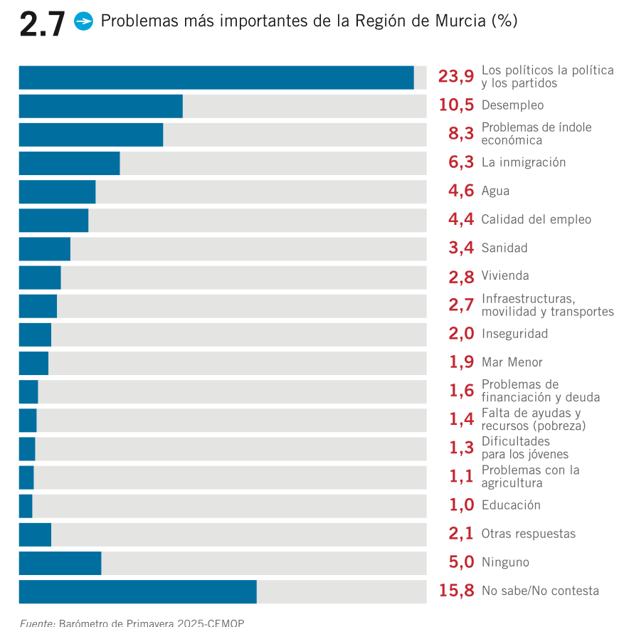 Según el estudio, los problemas percibidos por la ciudadanía como tales, siguen siendo los mismos que los reflejados en anteriores estudios, quedando un poco más abajo de los primeros puestos la inmigración, en cuarto lugar; el agua, en quinto lugar; seguida de la calidad del empleo, la sanidad y la vivienda. El Mar Menor baja hasta la undécima posición.