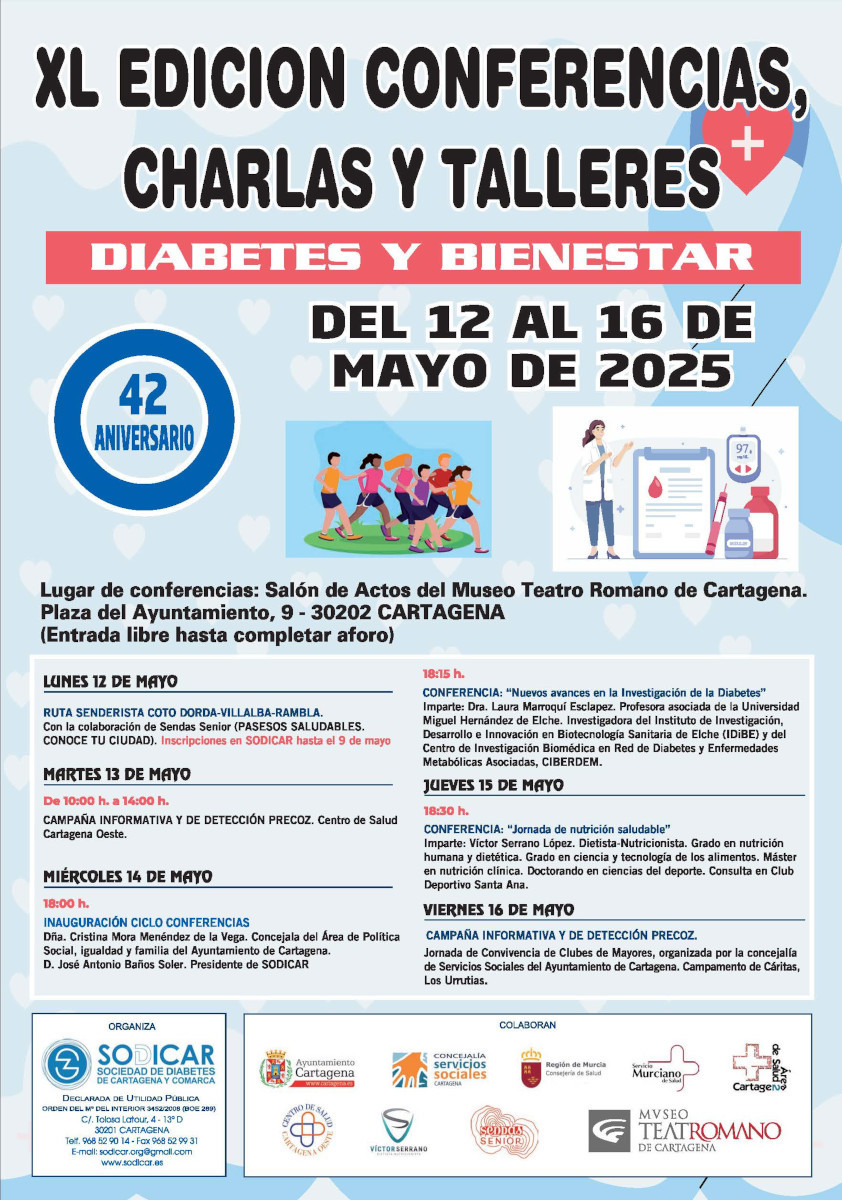 La Sociedad de Diabetes de Cartagena y Comarca (Sodicar) ha organizado la XL edición de Conferencias, charlas y talleres, del 12 al 16 de mayo de 2025.