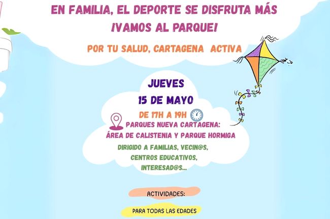 Con motivo del Día de la Familia en el parque activo de Nueva Cartagena se celebra este Jueves 15 de mayo, en horario de 17,00 a 19,00 horas, en los equipamientos biosaludables y de calistenia junto al Local social de la A.VV Nueva Cartagena.