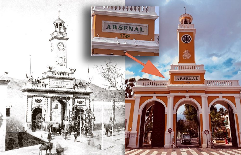 Se ha instalado sobre la entrada principal la inscripción de 1749, año en el que se conmemora la aprobación del proyecto definitivo de construcción del Arsenal del Ingeniero Sebastián Feringán, en tiempos de Fernando VI. En las fotos adjuntas se observan la puerta en 1874 con fechas conmemorativas y en la actualidad.