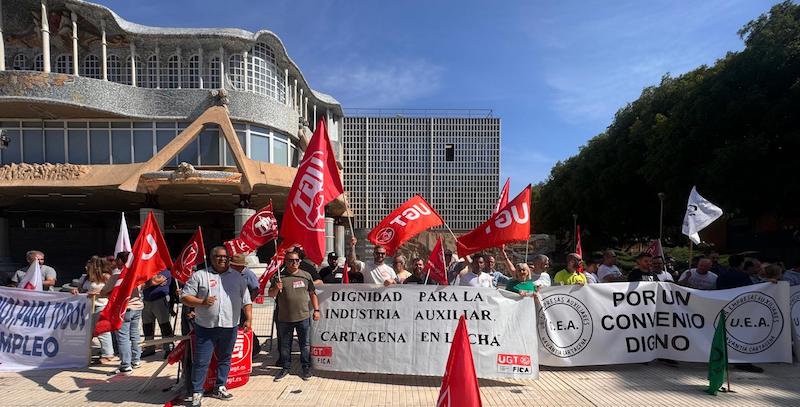 Esta mañana trabajadores y delegados de las empresas auxiliares del sector del metal, que en su mayor parte trabajan en grandes factorías como Navantia, Repsol y otras empresas del Valle de Escombreras, además de Sabic, se han concentrado frente a la Asamblea Regional de Murcia para exigir el cumplimiento del actual convenio del metal de la Región de Murcia y el desbloqueo de las negociaciones de las mesas técnicas.
