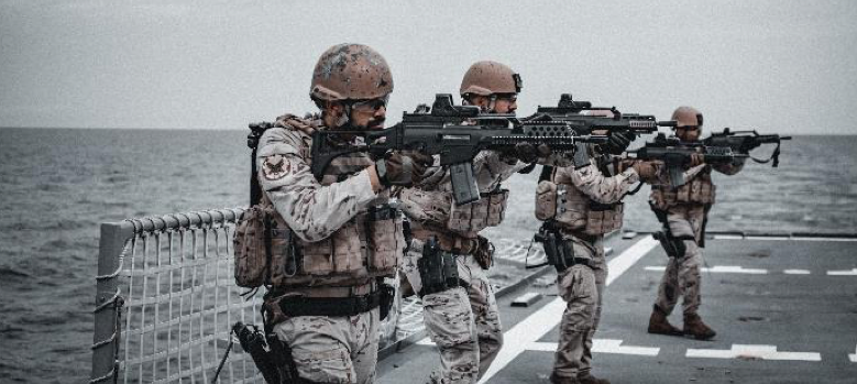 El buque de acción marítima ha partido desde Cartagena hacia el estrecho de Gibraltar y el mar de Alborán, donde reforzarán la seguridad, además de recalar en Melilla durante cuatro días. Imagen del equipo operativo de a bordo