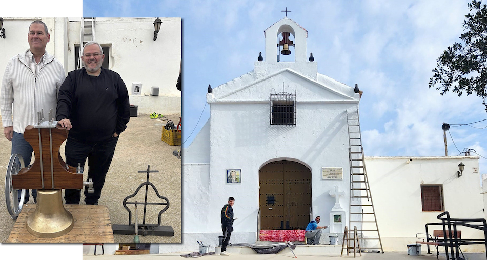 El instrumento de percusión de la ermita de la Virgen de la Soledad volverá a sonar este próximo domingo en una eucaristía que comenzará a las 12:30 horas y será oficiada por el capellán de la cofradía, Lázaro Gomariz López, quien será quien efectúa la bendición, y a quien se observa con el hermano mayor, José Antonio García, junto a la antigua campana y a la restaurada, en la misma jornada en la que ha sido colocada en el campanario.