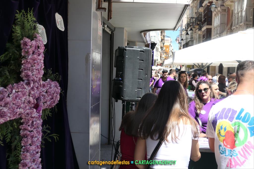 Bajando hacia el puerto por la calle Cuatro Santos se ubican los marrajos, junto a lo que debe ser su futuro museo, que rodean con una gigantesca barra que llevan jóvenes procesionistas. Allí está la morada cruz que se inauguró, con pregón, la noche anterior en el callejón de Bretau, donde sigue el altar de esta edición floreada. La Cofradía del Nazareno fue la pionera en 1975 de celebrar la 'Cruz de mayo', pero la incomodidad generada por tanta gente que hay estos días en la calle Jara provocó que hace tres ejercicios trasladasen su 'campamento'.