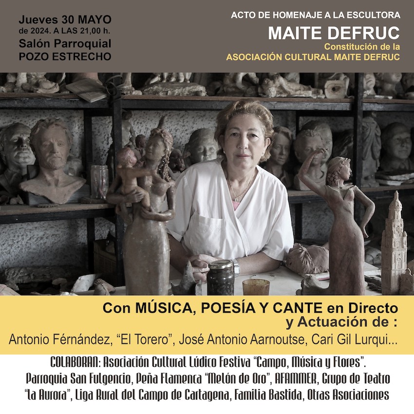 Los festejos primaverales de Pozo Estrecho cierran definitivamente su programa de 2024 con el tributo que se le rendirá a la recordada escultora este jueves, en un acto que también servirá para presentar la asociación cultural que llevará su nombre. Tendrá lugar en el salón parroquial (21 horas) y tendrá música, poesía y cante en directo con Antonio Fernández, 'El Torero', José Antonio Aarnoutse, Cari Gil Lurqui...