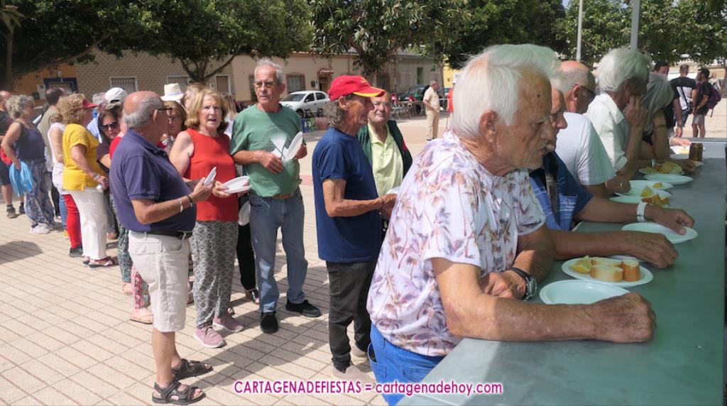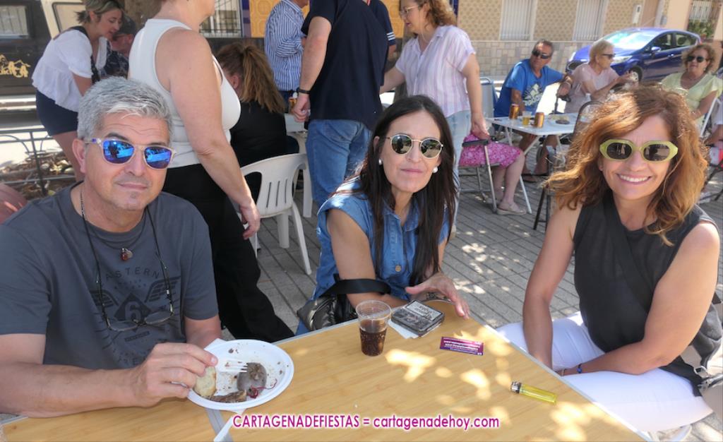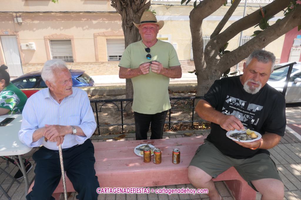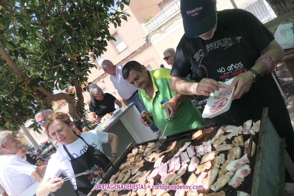 El inicio es la chocolatada y churros de las nueve de la mañana, para a las once y media llegar el inicio de una moraga y una barbacoa que tiene caliente la plancha, por lo menos, hasta las tres de la tarde. Por ahí pasan sardinas, morcillas (han vuelto con normalidad este año tras quitarse en 2023 para evitar tensiones), panceta y lomo sin descanso para saciar el apetito de unos asistentes que han montado mesas con amigos y familiares, sucediéndose las tertulias agradables.