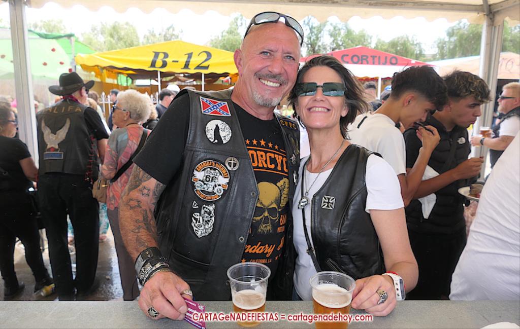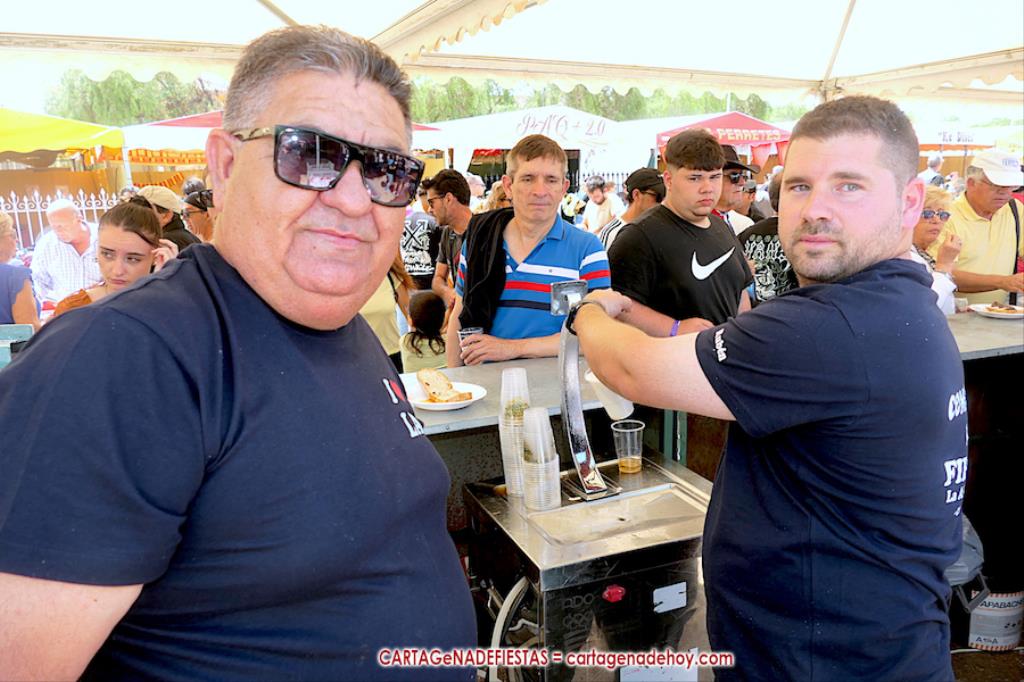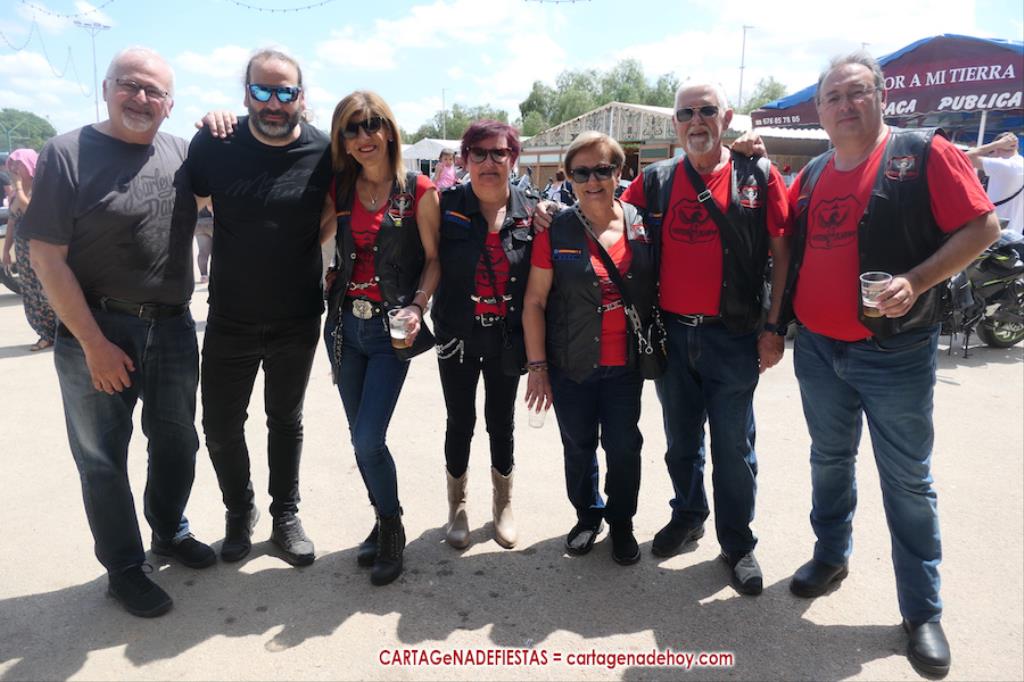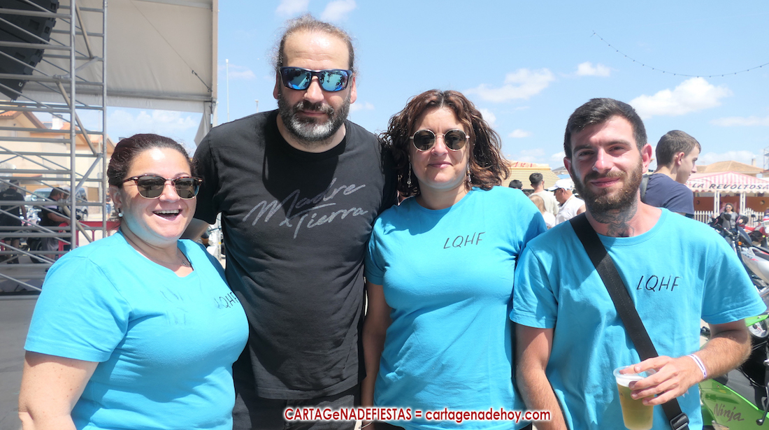 La jornada también incluyó carreras de cinta en moto y la música en directo con el rock andaluz de 'Sharabia', a cuyo cantante, Juan Arroyo 'Chiqui', se le observa en la foto adjunta con tres integrantes de una peña aljorreña.