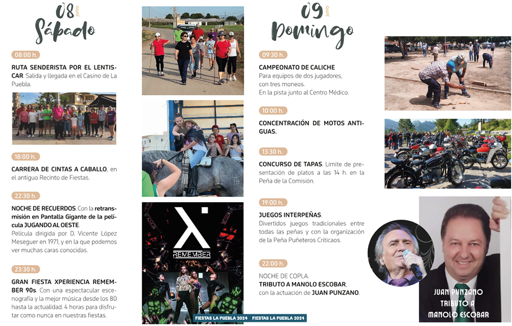 Por la noche tuvo lugar el chupinazo y puesta de largo del recinto festero y la primera verbena, siendo 'Orquesta Caribe Show' la que puso la música. El programa preparado por la comisión festera que preside Javier León sigue este fin de semana. Esta mañana ha tenido lugar la ruta senderista por El Lentiscar y esta tarde es la carrera a cintas a caballo, para por la noche tener lugar un cine de verano especial, pues muchos espectadores conocerán a los que aparecen en la gran pantalla con la película 'Jugando al oeste', dirigida por Vicente López Meseguer en 1971. A su conclsión, fiesta 'Xperiencia Remember', que anuncia una estupenda escenografía acompañando a las canciones desde los años ochenta a ahora.