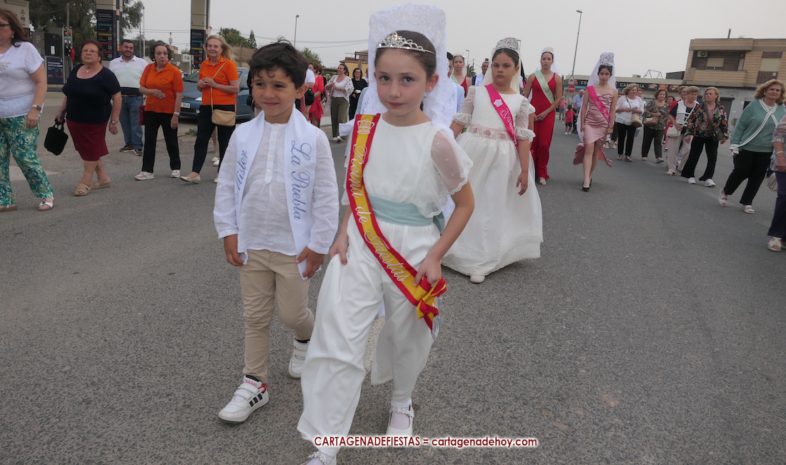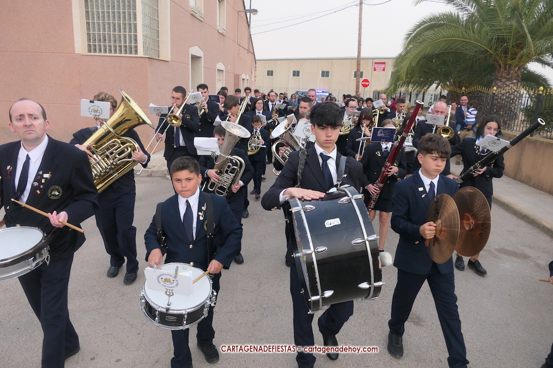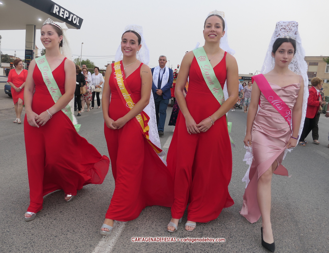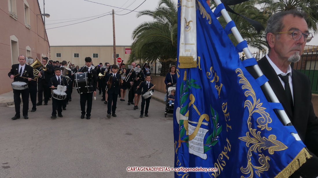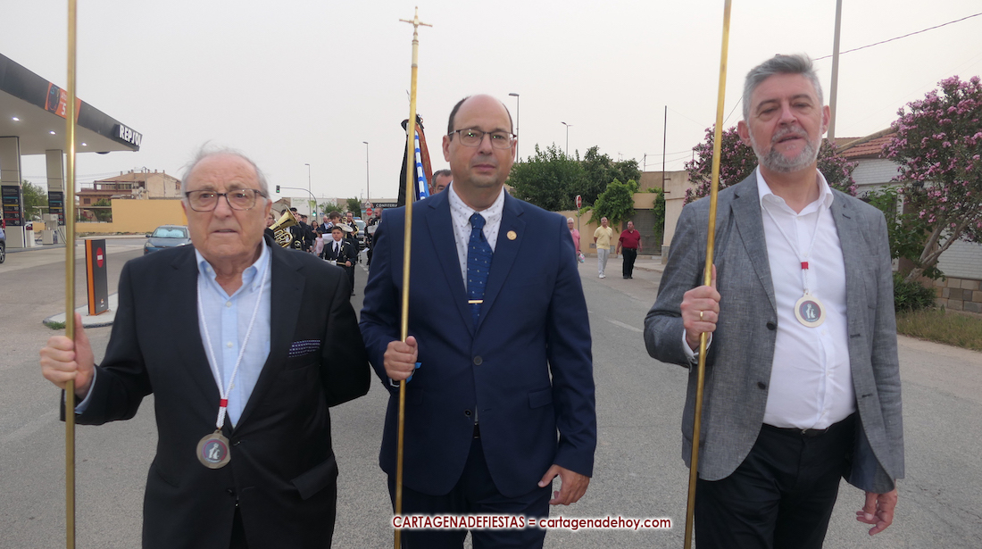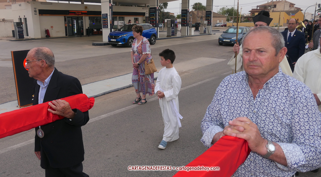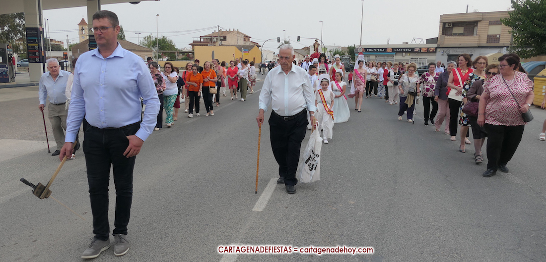 Ese día fue ayer, formándose una peculiar procesión con los vecinos en hilera en ambos costados del cortejo central, cuyo avance iba anunciando el lanzamiento de cohetes, marchando en cabeza la corte de honor de las fiestas y cerrando los músicos de la banda de El Pasico de Torre Pacheco.