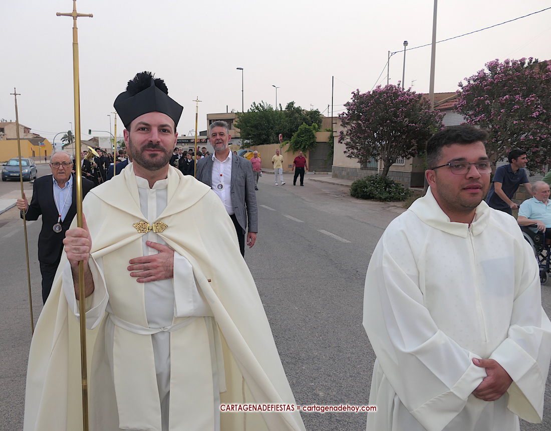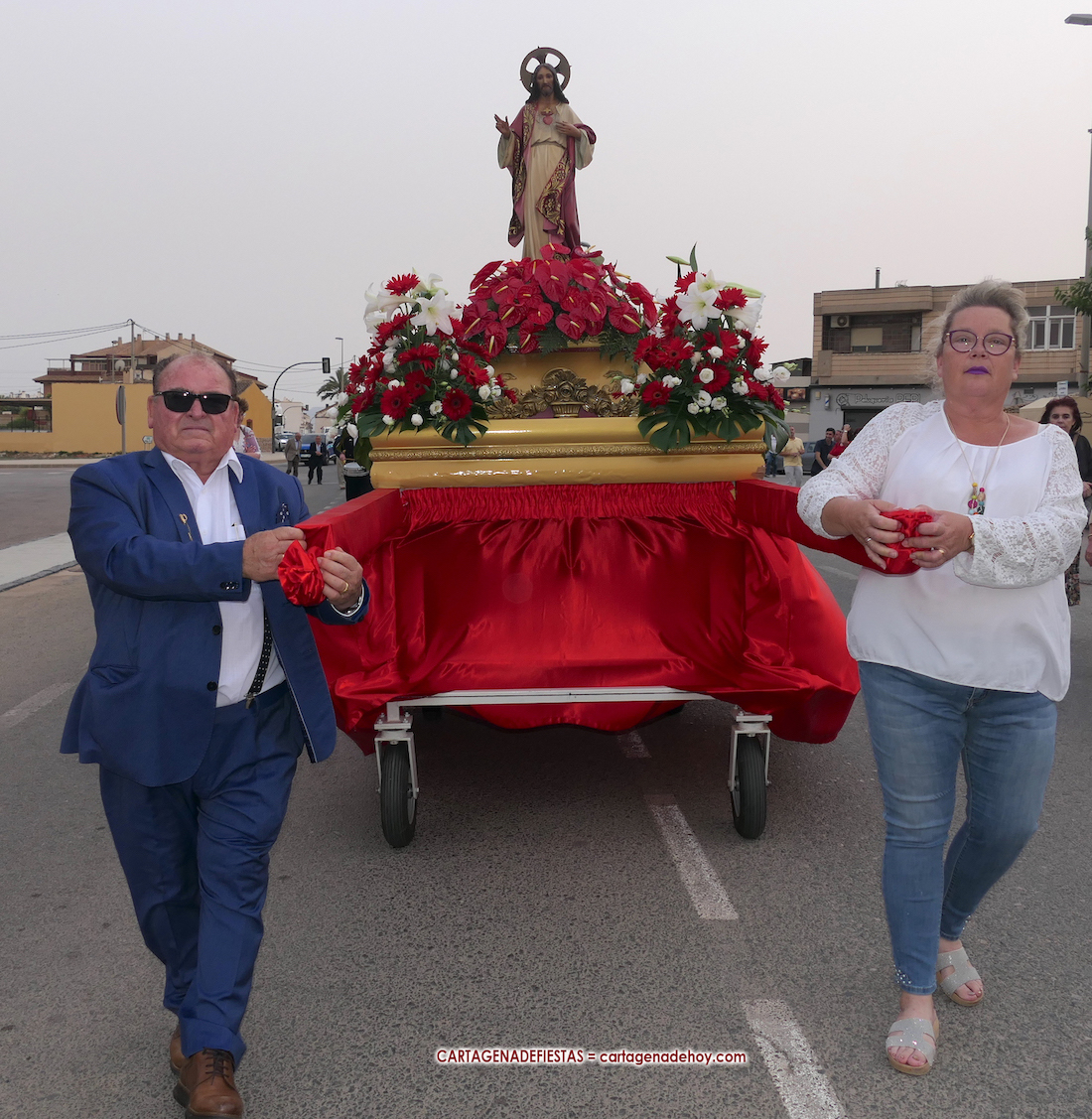 Tras el pequeño trono a ruedas que porta al Sagrado Corazón sobre un atractivo y colorido monte floral, marchaba el párroco, sucediéndole los presidentes de la asociación de vecinos, Pedro García; y de la junta vecinal municipal, Juan Manuel Ayaso, junto al hermano mayor de los procesionistas, José Fernández, pero que también está implicado (como 'mano de obra') con las fiestas locales, con lo que sabe bien "el esfuerzo que lleva sacar todos los años estos alicientes para los vecinos y tratar de que evolucionen a más, como ha sido este año ampliar los días de la patata y esa rutapa que ha sido un éxito", indicaba a Cartagena de Fiestas (Cartagena de Hoy).