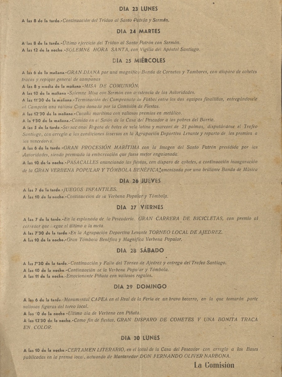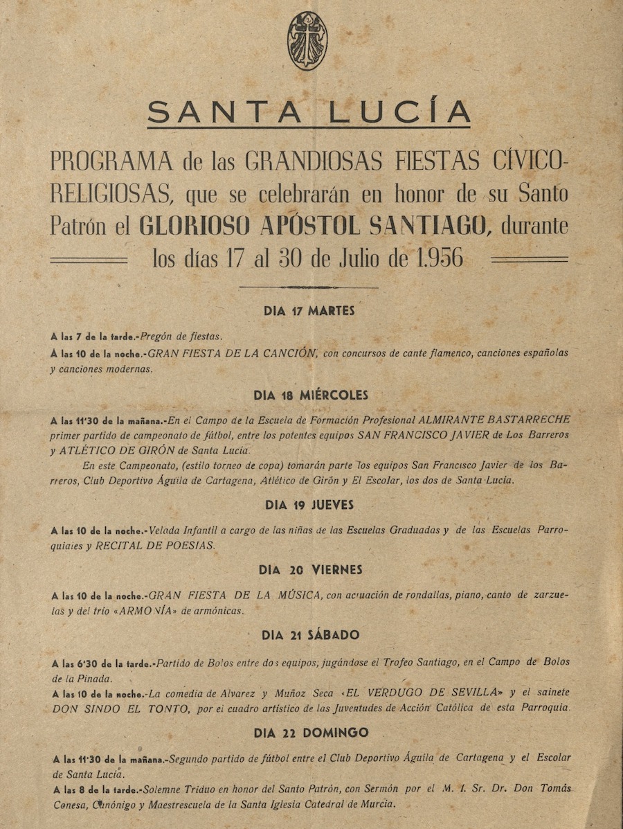 El Archivo Municipal de Cartagena publica el programa de 'las grandiosas fiestas civico religiosas' que hace cerca de siete décadas se celebraron en honor a Santiago Apóstol, presentando coincidencias y difencias con las actuales, las cuales culminan este fin de semana. Aquellas duraban dos semanas y, entre las numerosas propuestas, incluín la suelta de una becerra.