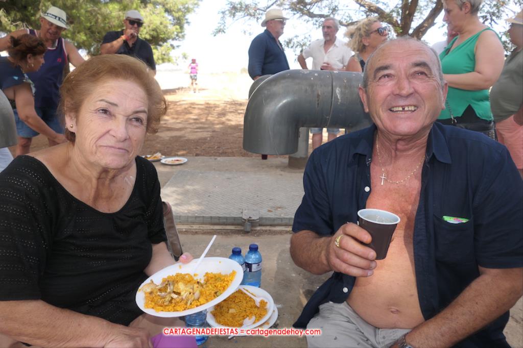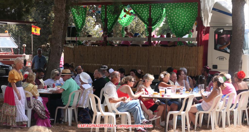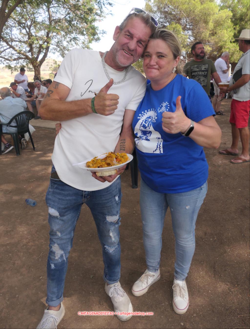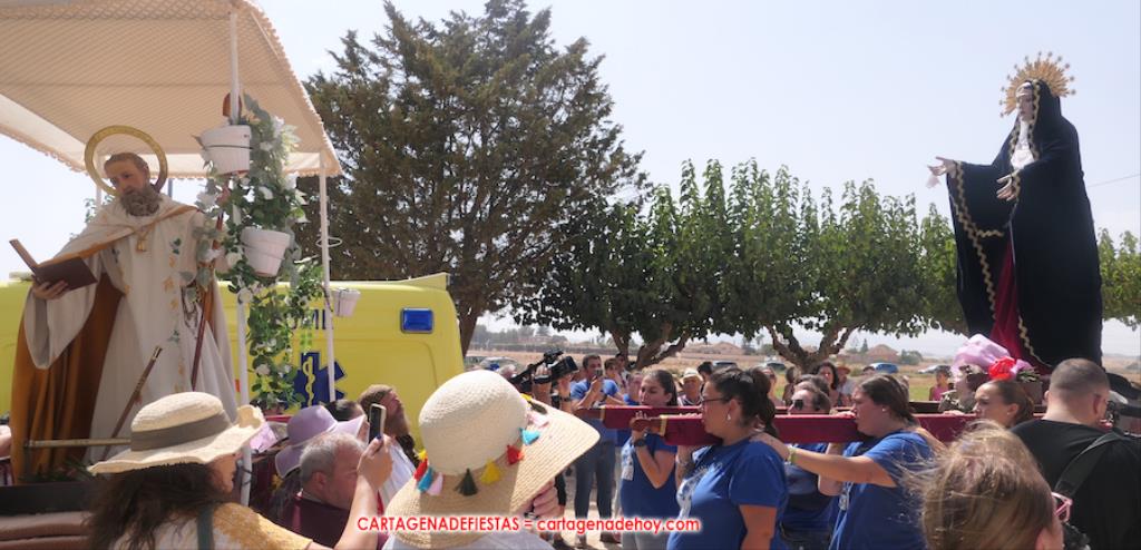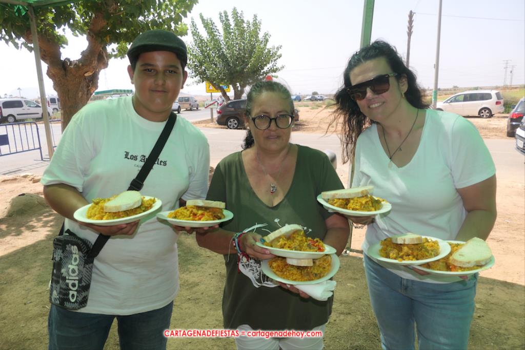 Karma21 ofrece escenas de la llegada de los romeros a la ermita unionense de Roche, donde el santo patrono cartagenero fue recibido por la Virgen de los Dolores y en cuya pinada tuvo lugar una gran convivencia en torno a un gigantesco arroz que culminó con cafe de puchero, desencadenándose durante ese alto varias 'batallas de agua'.