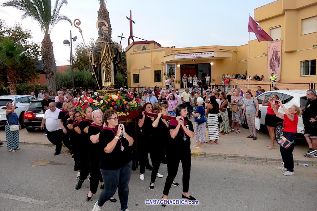Este año, en la procesión, ha sido novedad la configuración de la base del trono, lo que ha dado más visibilidad a las frutas y verduras (aportadas por la frutería 'En punto'), además de los rollicos, que van a los pies del santo ermitaño.