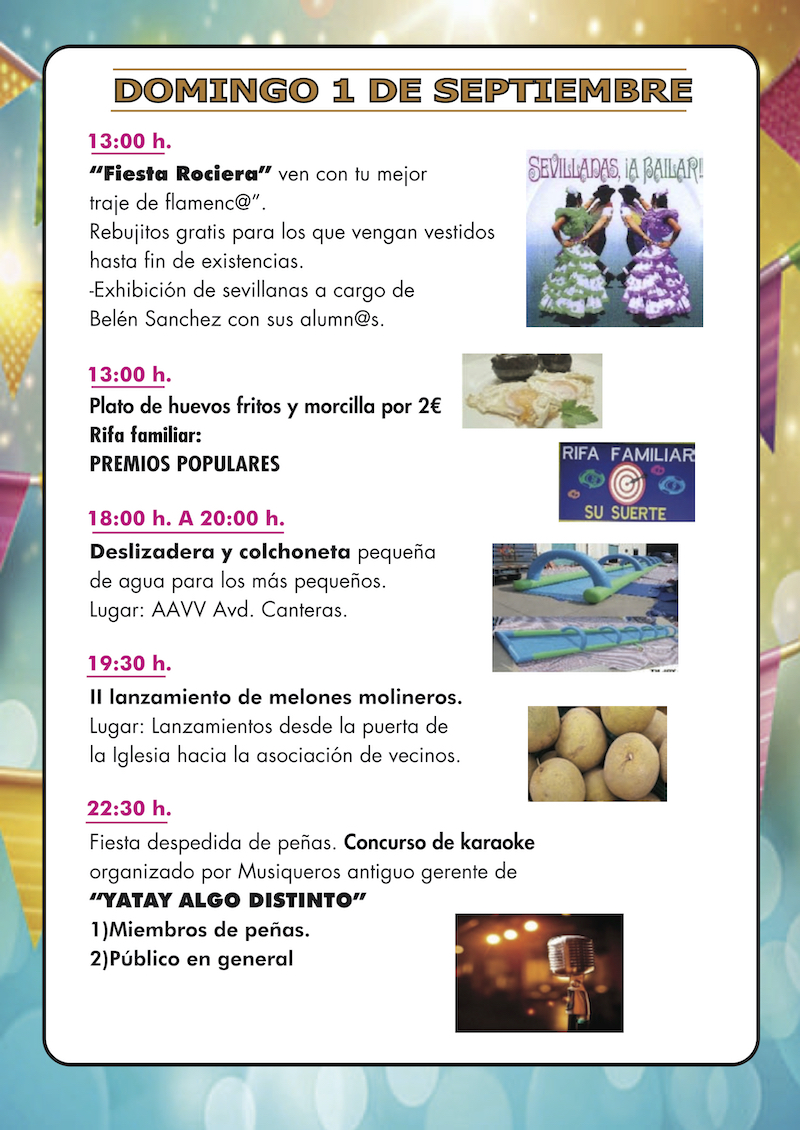 Tras el desfile de las peñas, llegará a las 22 horas el encendido de las casetas y el pregón a cargo de Fulgencio López Guirao 'El Parras' en una velada que incluirá la actuación de 'Los vecinos del cuarto'. El sábado llega la segunda edición del concurso de 'comilones' más 'Cinema Rapssodia' con Pedro Segura y una 'Fiesta remember', mientras que el domingo es para la fiesta rociera y los concursos de karaoke y de lanzamiento de melones molineros. El programa festero llegará hasta el 8 de septiembre.