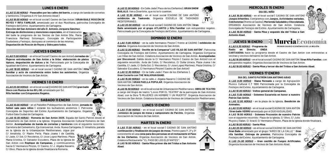 Siso Santa y su grupo actúa esta noche en la cantina del local social, lugar donde desde hoy habrá pulpicos en la barra exterior. Las fiestas oficiales comienzan el lunes con pasacalles, pregón de la edil Paqui Martínez Sotomayor y elección de Antonio Jorquera Sánchez como 'San Antonero del año'. La romería será el día 11, el 12 hay carnaval y arroz popular y en la jornada final del 17 de enero, día del patrón, será la bendició de animales, el baile del vermú y la procesión.