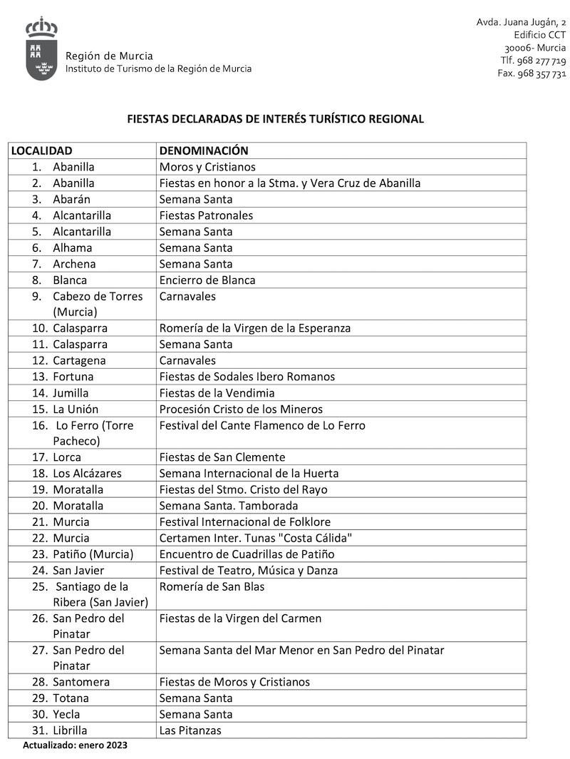 Creo que, respecto a esto último, el quid de la cuestión es que las fiestas cartageneras fuera del casco histórico las organizan los propios vecinos (una seña de identidad de esta tierra) en casi su totalidad a diferencia de los otros municipios, donde es el ayuntamiento el que lleva las riendas y el que se preocupa de consagrarlas con papeles. Por aquí, bastante hacen los vecinos en sacarlas adelante cada año de forma altruista, por lo que deberían ser las autoridades las que se encargasen de esas tramitaciones cuando vieran que reúnen los requisitos. Sería un gran detalle con sus contribuyentes.