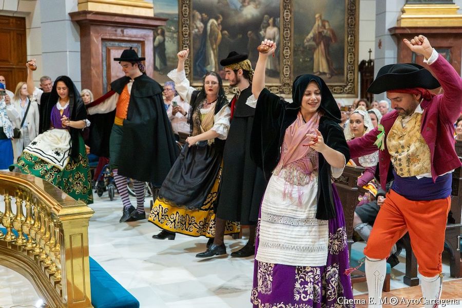 La basílica menor de la Virgen de la Caridad acoge un acto repleto de festeros ataviados con vestimenta tradicional que ha traído a Cartagena una talla peregrina de la Virgen de los Desamparados. La tarde contó con la participación de Carthagineses y Romanos y los bailes del Grupo Folclórico de La Palma.