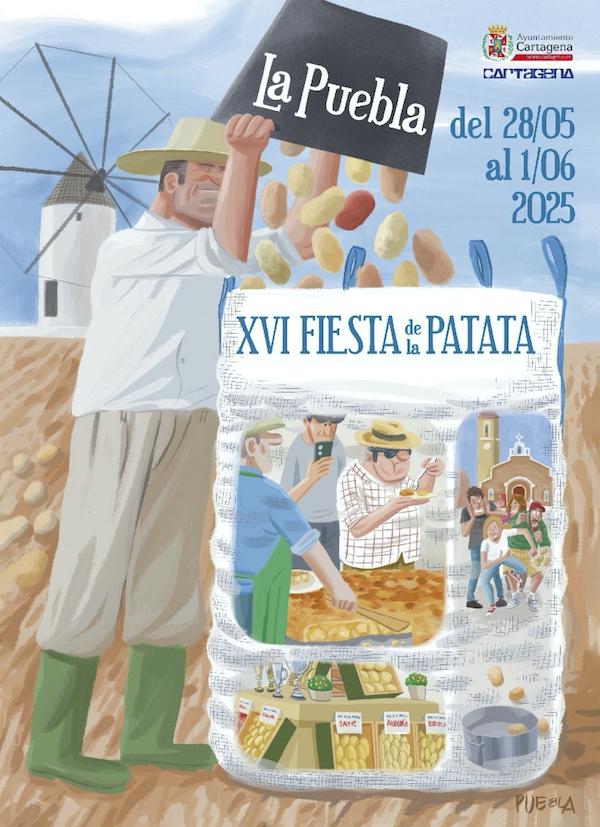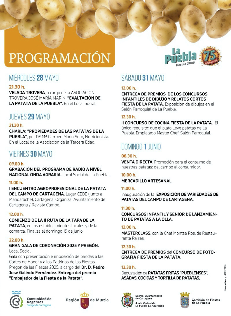 La diputación cartagenera de La Puebla programa un sinfín de actividades festival para celebrar la genuina patata del Campo de Cartagena con el impulso del Ayuntamiento. Del 28 de mayo al 1 de junio hay velada trovera, charlas, lanzamiento de patata a la olla, venta directa por parte de los agricultores, mercadillo, exposición de variedades, ruta de la tapa por diferentes bares de la comarca, concurso de cocina y degustaciones de patatas asadas, cocidas y tortilla gigante.