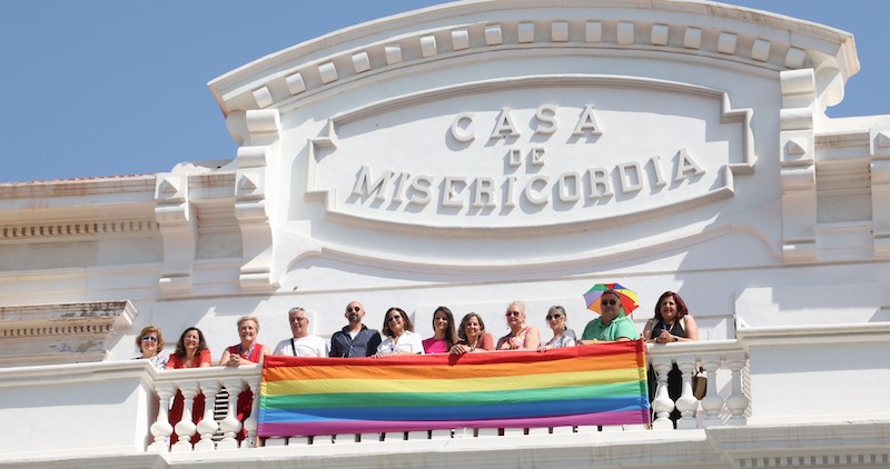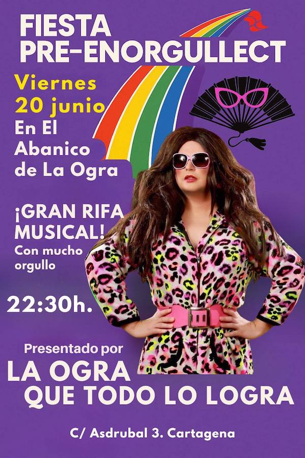 El epicentro de la celebración del 'Orgullo' tendrá lugar la próxima semana en Cartagena, pero estos días hay actos previos como fue ayer la exposición de carteles históricos de 'EnorgulleCT' en el Abanico de la Ogra, en la calle Asdrúbal, donde hoy hay una noche festiva presentada por 'La ogra que todo lo logra'. En la foto, la bandera multicolor en el balón del Rectorado de la UPCT